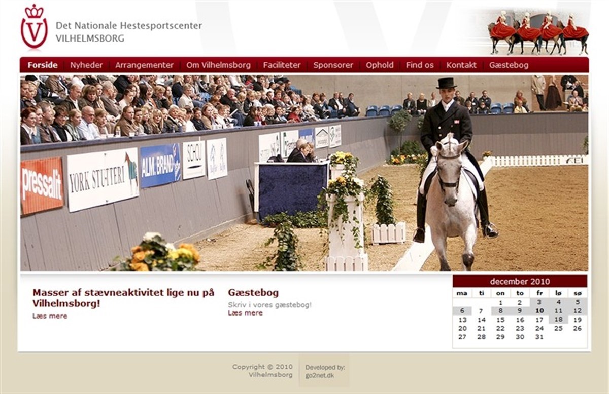 Vilhelmsborg er nu online med en ny hjemmeside, der formidler informationen til brugerne på en lettere og mere overskuelig måde. En af de helt store forbedringer er kalendermodulet, der hurtigt giver et bredt overblik over nuværende og kommende arrangementer på hestesportscentret. Desuden er det nu muligt at tilmelde sig et elektronisk nyhedsbrev der jævnligt udsendes til de tilmeldte e-mailadresser, og herved kan man let holde sig opdateret med hvad der sker på Vilhelmsborg. Du kan besøge den nye hjemmeside ved at følge linket til højre.