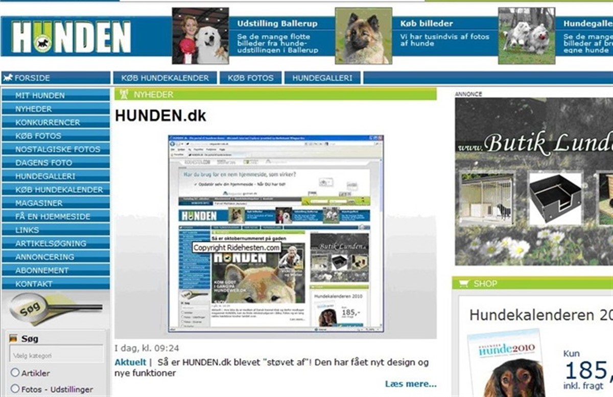 Der lægges dagligt nye godbidder ud til dig på HUNDEN.dk - f.eks. nyheder og dagens foto. Der vil også være konkurrencer, hvor du kan vinde skønne præmier til dig og din hund. Desuden kan du fremover selv være aktiv på hjemmesiden! Du kan nemt, hurtigt og gratis oprette gallerier med dine egne hunde, så hele "hunde-Danmark" kan se dem. Er du udstillingsinteresseret, så dyk ned i de "nostalgiske fotos". Der ligger en bunke gamle udstillingsbilleder på, som du kan kommentere på. Du kan naturligvis også købe billeder, bestille hundekalender, søge efter titler og emner på tidligere bragte artikler i Hunden osv. Vind præmier med din egen hund Præmien i denne måneds konkurrence er 3 x et sæt bestående af en kop, en musemåtte samt et puslespil - med din egen hund som motiv! Du deltager i konkurrencen ved at oprette et galleri med din hund på HUNDEN.dk Se mere til den flotte nye hjemmeside via linket!