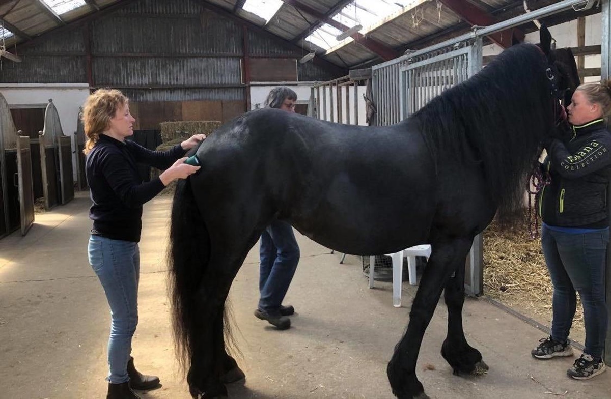 – Derefter får de lov til at hilse, og det skulle så gerne være det. I Belgien har de også succes med ammehopper, selv om de ikke har haft føl indenfor de sidste par år. Vi valgte dog friserhoppen Maitay, ejet af Maja Pedersen i Skibby, som havde mistet sit føl en lille uge forinden, og de kom hele vejen fra Skibby til Fredericia, fortæller Marianne Newe.