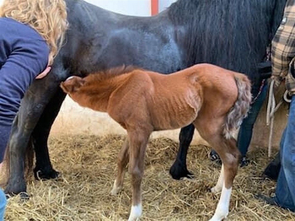 Herefter får hoppen en oxytocin-indsprøjtning for at lægge mælk ned. Hoppen kommer ind i en boks, hvor føllet føres direkte til yveret. Det er vigtigt, at hoppe og føl ikke først bliver introduceret, og på dette tidspunkt holder man stadig hoppen, indtil føllet er færdig med at patte.