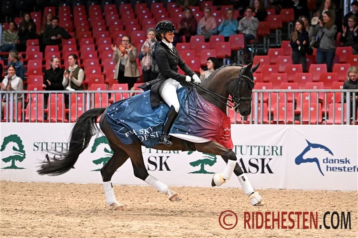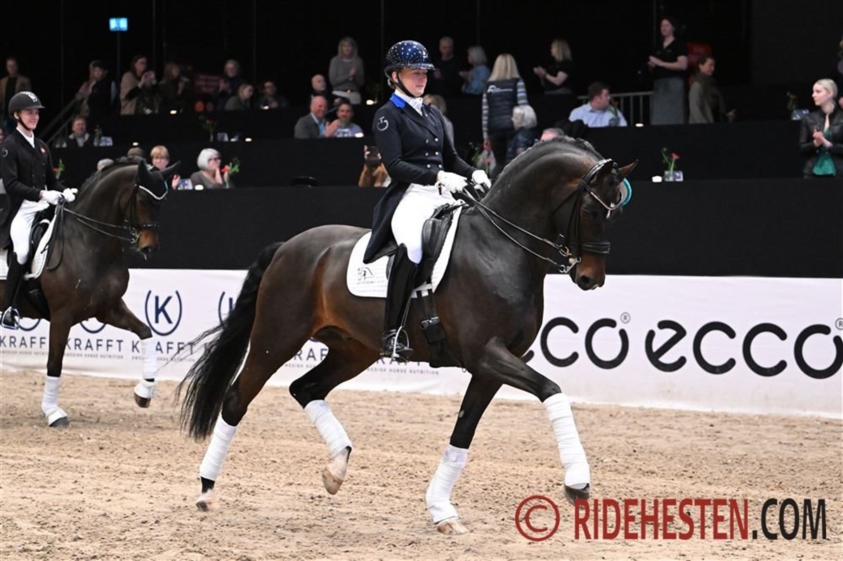 På andenpladsen blev det Nanna Skodborg Merrald med Blue Hors Farrell e. Fürstenball/ Dacaprio. Den 12-årige avlshingst dansede derudad i en letfodet og svævende trav. Der var flotte sidetraversader med stor skulderfrihed og overtrædning, en flot zigzag-traversade, rigtig flotte toer- og treerchangementer, som var flydende og gennemsprungne. Det blev til en procent på 74,571%.