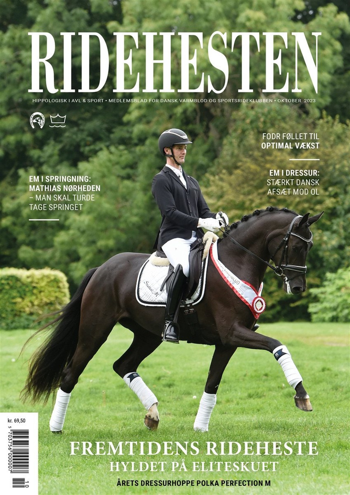 På forsiden denne gang er Årets dressurbetonede hoppe i Dansk Varmblod, Polka Perfection M e. Secret/Fürstenball (opdr. Sanne Mathiasen), under berider Dennis Kjær.