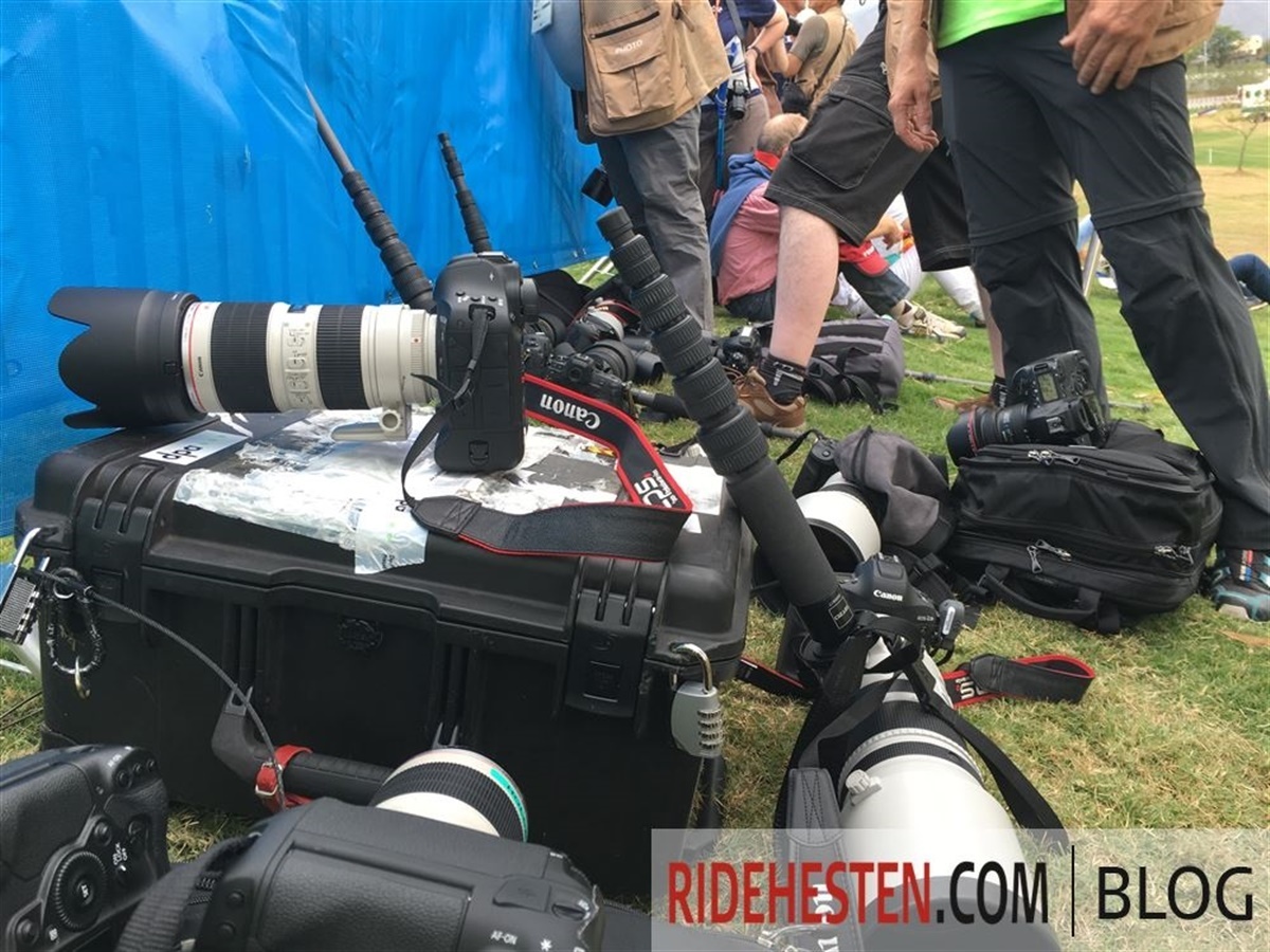 Det er også hårdt arbejde - jagten på det gode billede, den gode historie, som I hjemme i Danmark vil finde interessant. Jagten på det gode billede er især hård, når terrrænspringningen til military bliver afviklet. I dagene inden da går nogle af fotograferne (incl. Ridehestens udsendte) den knap 6 km lange bane igennem, for at finde det eller de steder, hvor man får det bedste foto. Normalt vil der ved forhindringerne være opsat et aflukket område til fotograferne, så man ved, man kan komme til at fotografere den enkelte forhindring, og ikke kæmpe om udsynet med de mange tilskuere. Sådan var det ikke her i Rio i går, da terrænspringningen blev afviklet. Derfor var vi mange, som besluttede, at banens flotteste forhindring, vandforhindring nr. 4, måtte give de bedste billeder, og det viste sig heldigvis også at være tilfældet. I praksis betød det, at jeg gik ud i terrænet kl. 7.30 for at få den bedste plads ved denne forhindring, og så holdt jeg min plads, indtil første rytter red ud kl. 10.00 og til den sidste red gennem forhindringen kl. 15.00. Det blev en lang og varm dag uden mad og mulighed for toiletbesøg, så væskeindtaget måtte der jo så økonomiseres med.