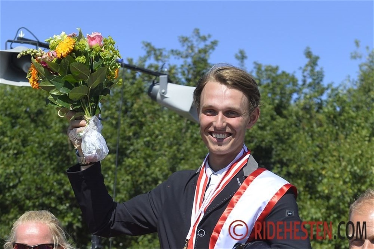 I sadlen på Fascination e. Favorit Ask/Lando (opdr. Jørn-Ove Jørgensen) har Peter Flarup netop leveret sit dressurridt, som er blevet bedømt til 33,60 strafpoint - og dermed er han foreløbigt placeret som nr. 14 efter 23 ekvipager.