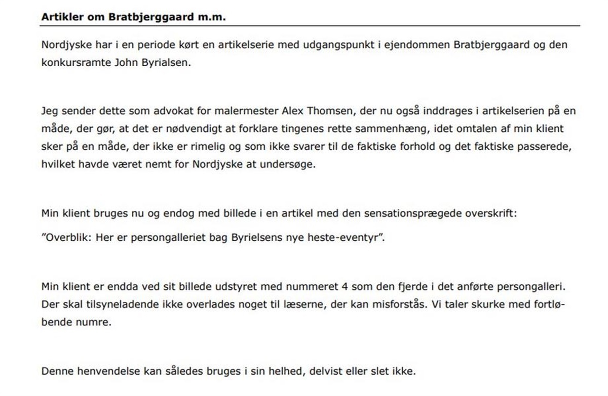 – Det er IKKE korrekt, når Nordjyske skriver, at de (Isabelle og Tobias) blev opsagt, fordi min klient skulle udleje til anden side. Han er således ikke en ond far, der smider søn og svigerdatter på porten, fordi han skal leje ud til de store suspekte heste-fyre (...).