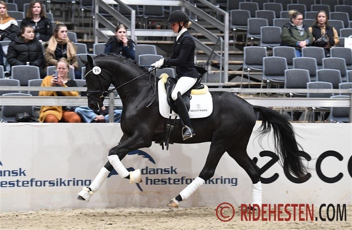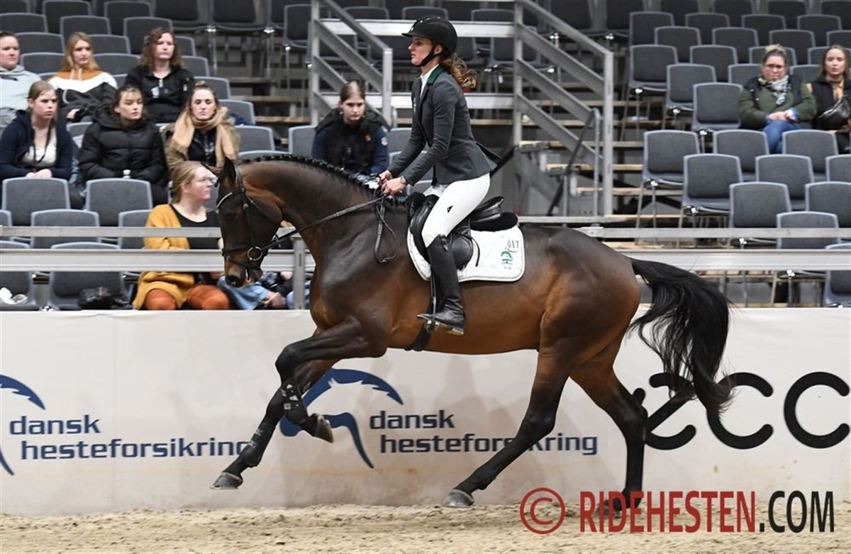 Dressurhesten Åtoftens Springtime ses her ved indsyningen redet af berider Mette Sejbjerg Jensen. Foto: Ridehesten.com/Annette Boe Østergaard