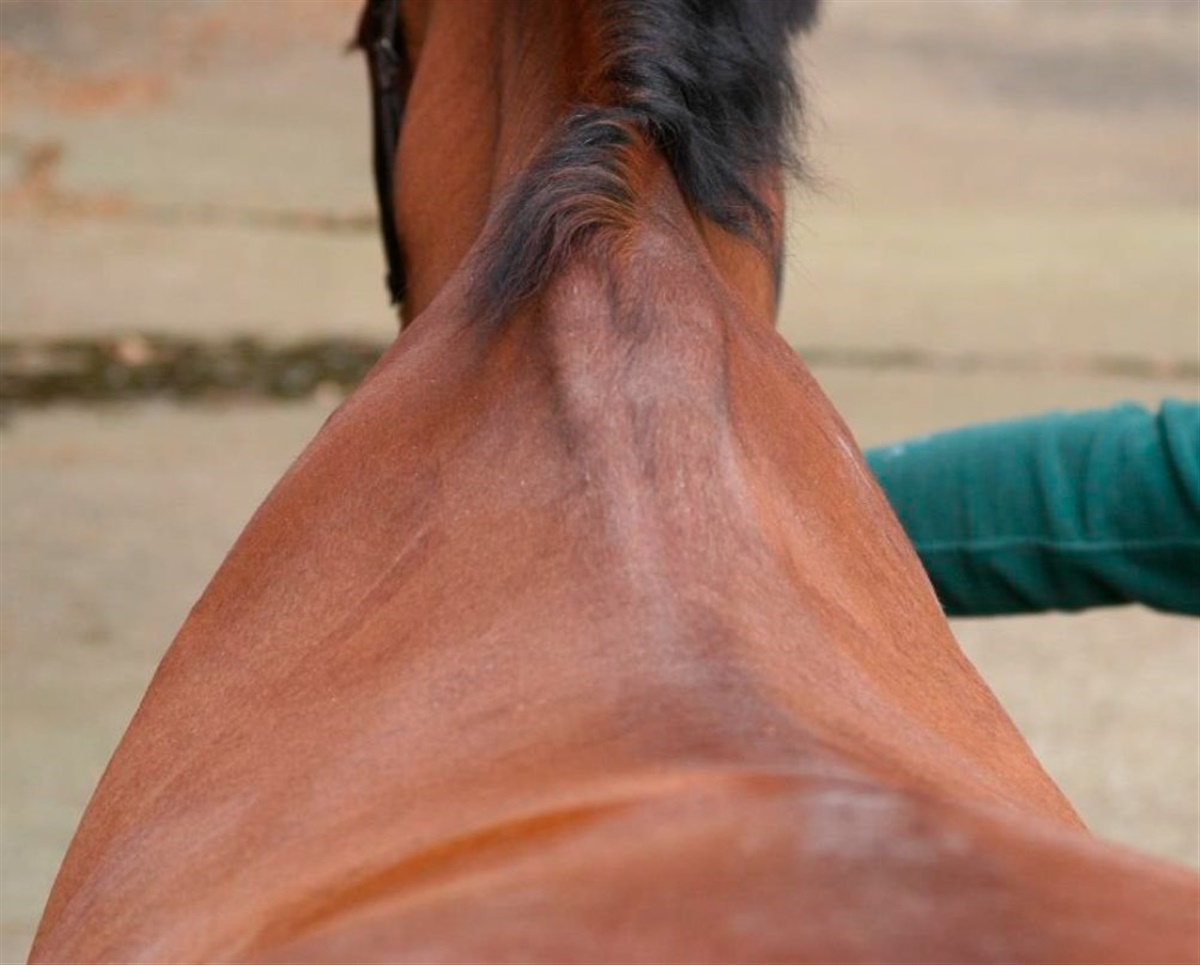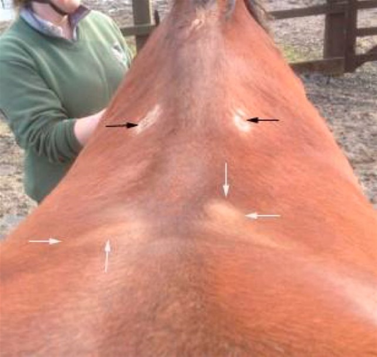 Ofte kan man se en veludviklet nakk muskulatur, men en udpræget fordybning bag hestens skulder, som antyder at hesten er redet med en fejltilpasset sadel igennem længere tid.