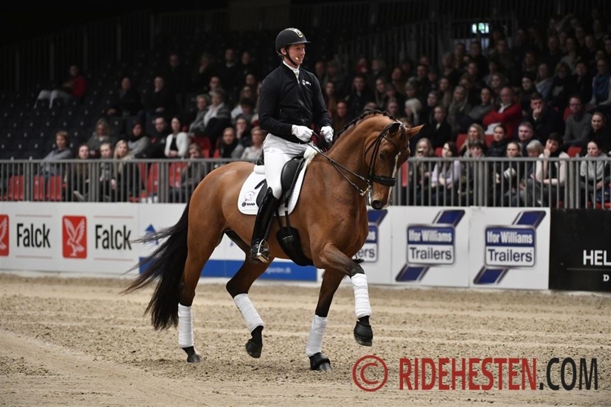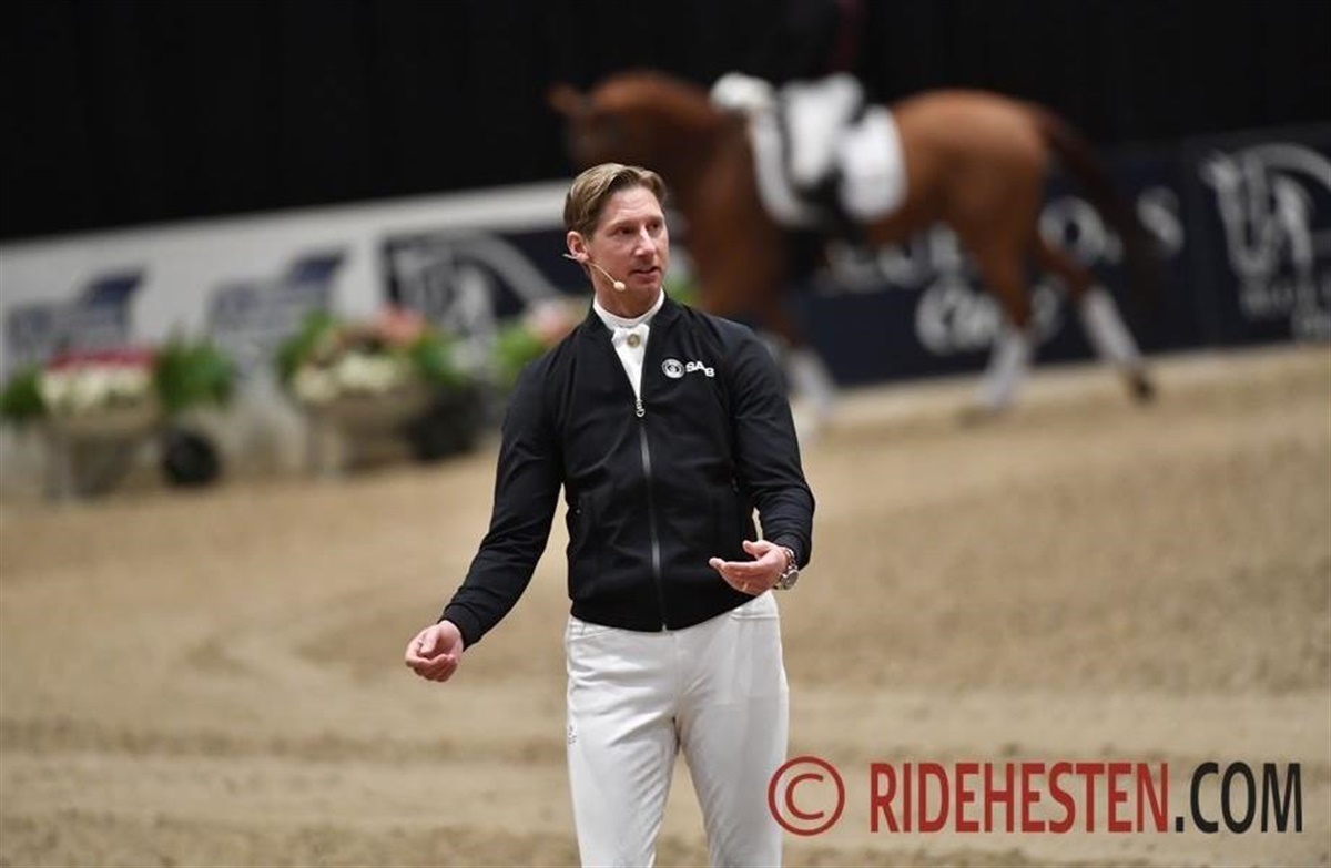 På et tidspunkt i clincen slap han tøjlerne og klappede højt med de hvide ridehandsker. En øvelse som han bruger for at vænne hoppen til høje lyde. Hesten skal være tryg til Grand Prix.