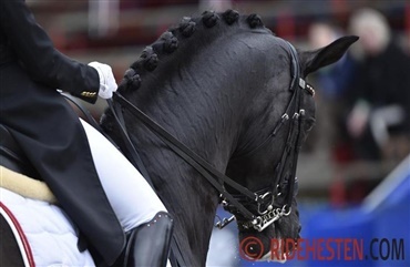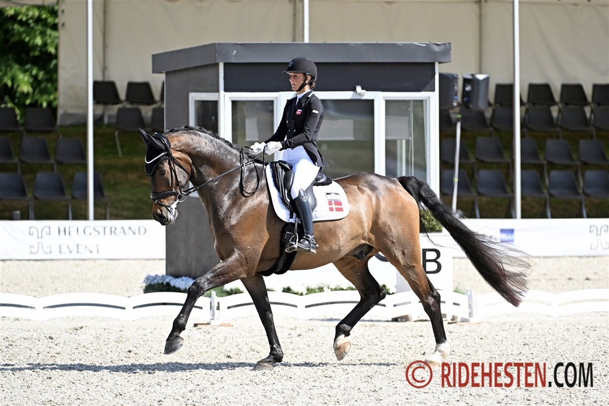 Bianca Andersen, der med Runehøjs Skyline e. Sir Donnerhall II/ Blue Hors Future Cup (opdr. Birgitte Thomsen og Sten Andersen) i går blev nr. 1 i den indledende klasse, red i dag en kür til flotte 75,334%.