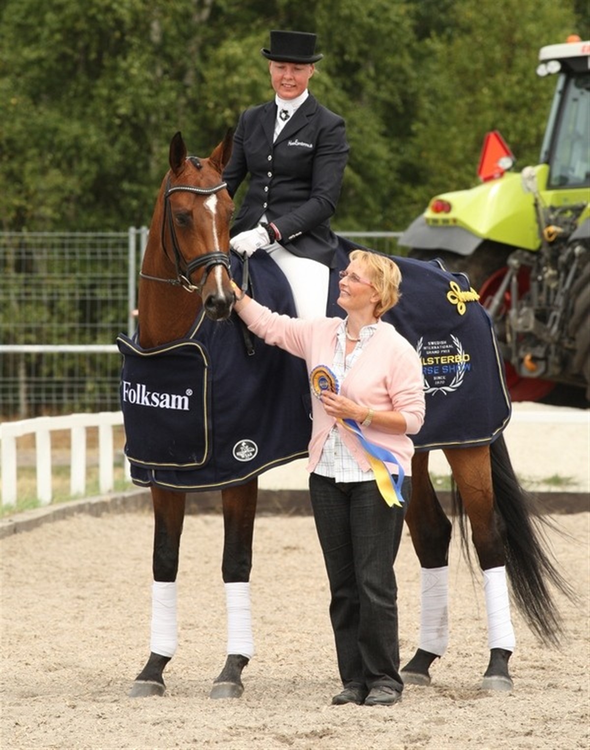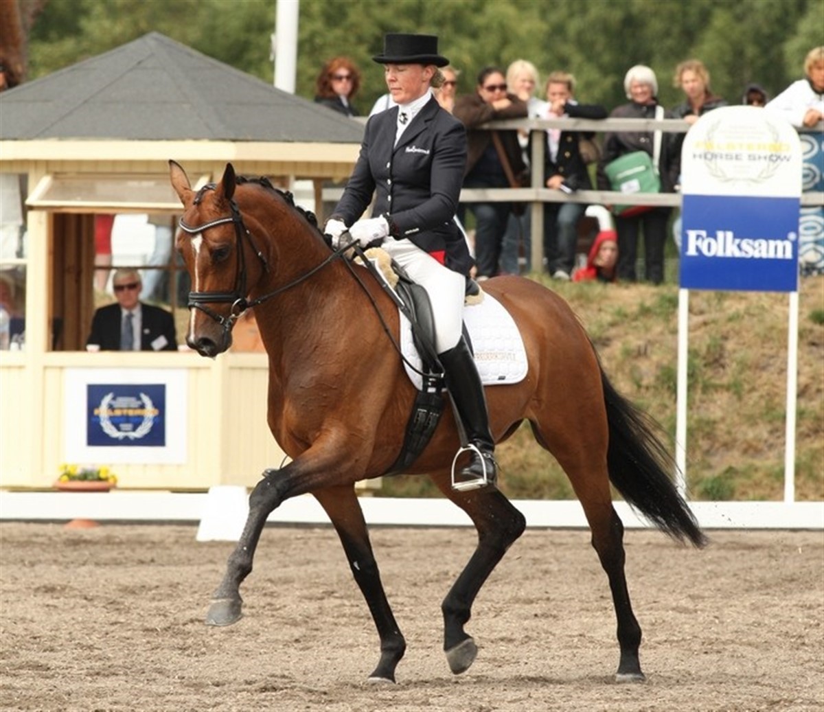 Dannebro gik til tops på dressurstadion i Falsterbo her til middag efter en nervepirrende spændende 6-års finale med to danske deltagere. Dorthe Hoeck og Polka Hit Nexen kom til finalen efter en sejr i kvalifikationen, og publikum sad tæt på dressurstadion for at følge dagens finale. Den yndige brune hoppe dansede gennem travprgrammet med ynde og sving i bevægelsen, og i galopprogrammet viste parret, at changementerne er ved at være på plads. Der var heller ikke plads til nogle fejltagelser for den internationale toprytter Jan Brink havde lige forinden redet den tidligere danskeejede hingst Rosevelt ind på førstepladsen i kraft af et fremragende travprogram og en skridt der blev honoreret med 10-taller. I galopprogrammet kom nogle spændinger, og det kostede i changementerne, som ikke blev vist rene. Alligevel formåde Brink at hilse af til karakteren 71,048% Dorthe Hoecks ridt kunne man følge på resultattavlen og hele tiden blev hende og Polka Hits points samenlignet med Jan Brinks - det var tydeligt, at de to lå meget lige. Da Dorthes points kom op på tavlen lød der et gisp fra publikum Dorthe havde fået eksakt de samme points som Jan Brink. Da konkurrencen er svensk og dermed skal afvikles efter svenske regler, så skal der findes en vinder, og det betyder, at det er dommernes sidste 4 karakterer for hestens gangarter, rytterens opstilling mv. der afgør klassen, og her var den danske ekvipage bedste, og dermed dansk sejr i 6-års finalen. Det var første gang Dorthe Hoeck red i Falsterbo, og hun udtrykte stor beundring for stævnet efter sejren. For familien Hoeck var stævnet en vigtig brik i forberedelserne frem mod VM i Verden, der afvikles om to uger. Astrid Gemal og NOH Wizard, der også er på det danske landshold i Verden, sluttede på en 8. plads med 64,476% efter et flot travprogram, men i galoppen blev Wizard lidt stærk for Astrid og det kostede værdifulde points.