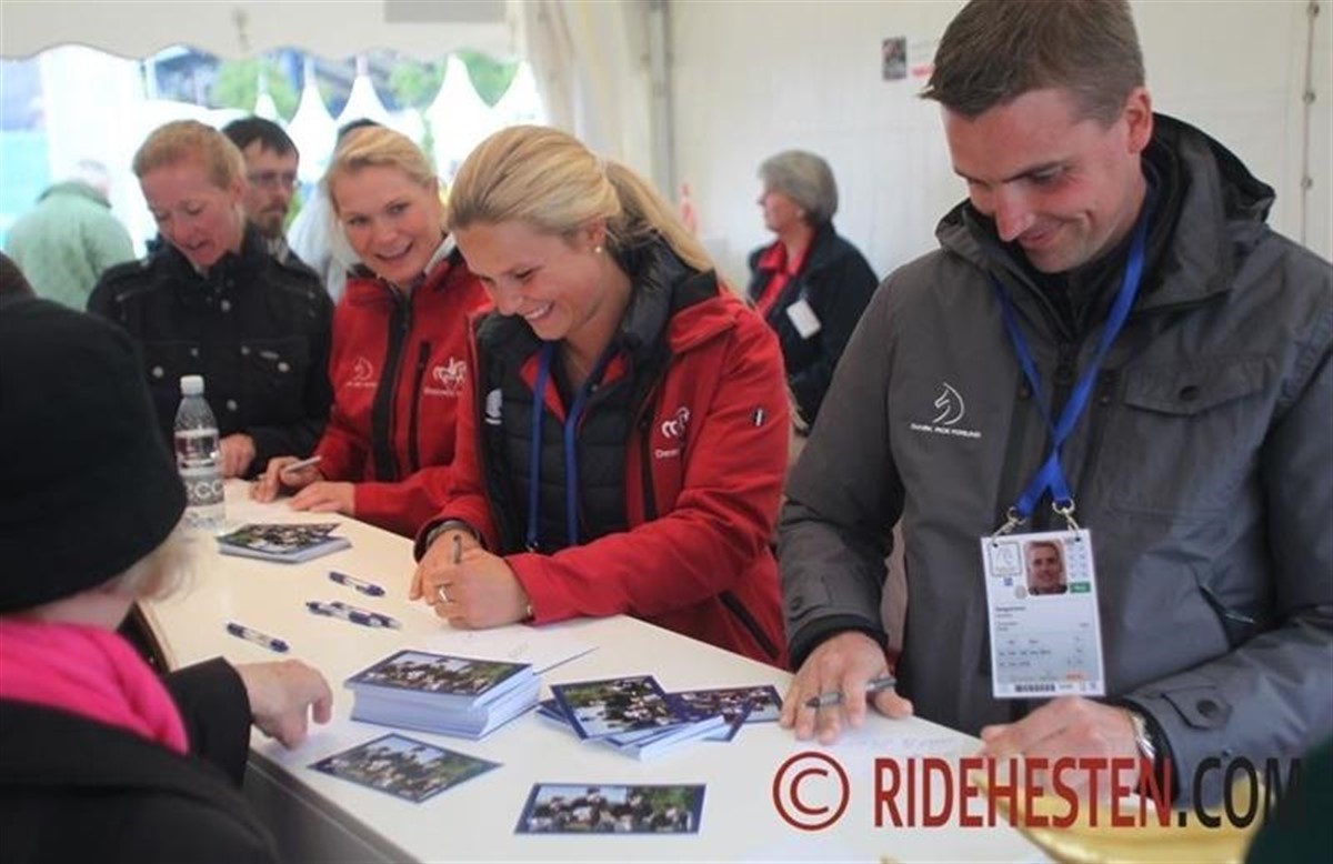 Autografskrivning på European-Hernings stand i The Danish Village i stævnepladsens udstillingsområde skulle vise sig at være en ualmindelig god idé. Det trak i eftermiddag mange dressurentusiaster af forskellig nationalitet og alder til danskerkolonien, hvor mange af dem benyttede chancen til at udveksle et par ord med en af deres favoritrytterere, der alle tog smilende imod deres fans.