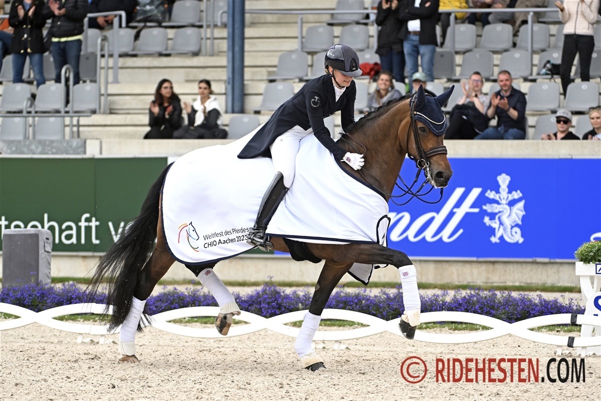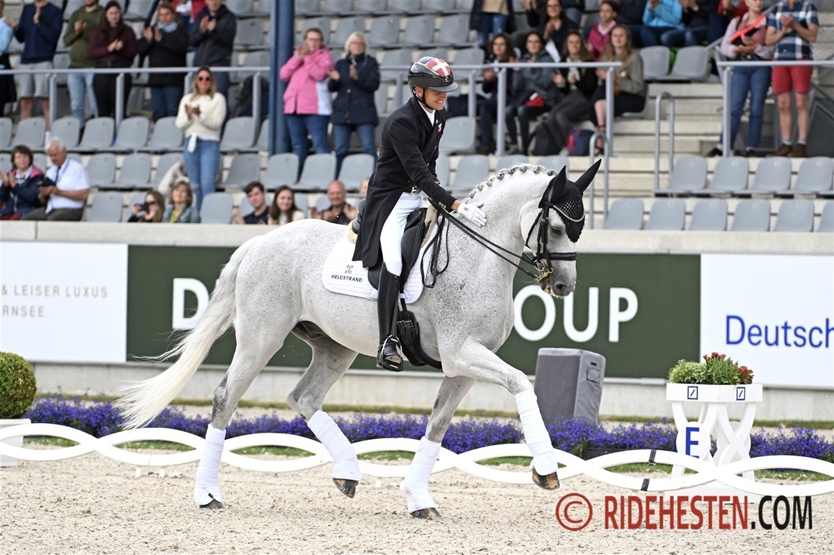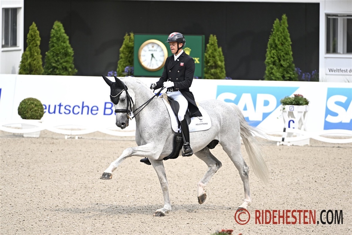 Det er ikke kun seniorrytterne som får lov til at ride i de flotte rammer i Aachen, for hvert år afholdes der også en klasse for ungrytterne. Sidste år var Sara Aagaard Hyrm den eneste danske repræsentant i den aldersgruppe, mens det i år er blevet Alexander Yde Helgstrands tur til at ride på Deutsche Bank Stadium. I går red de unge ryttere det individuelle program, mens det i dag var i kür.