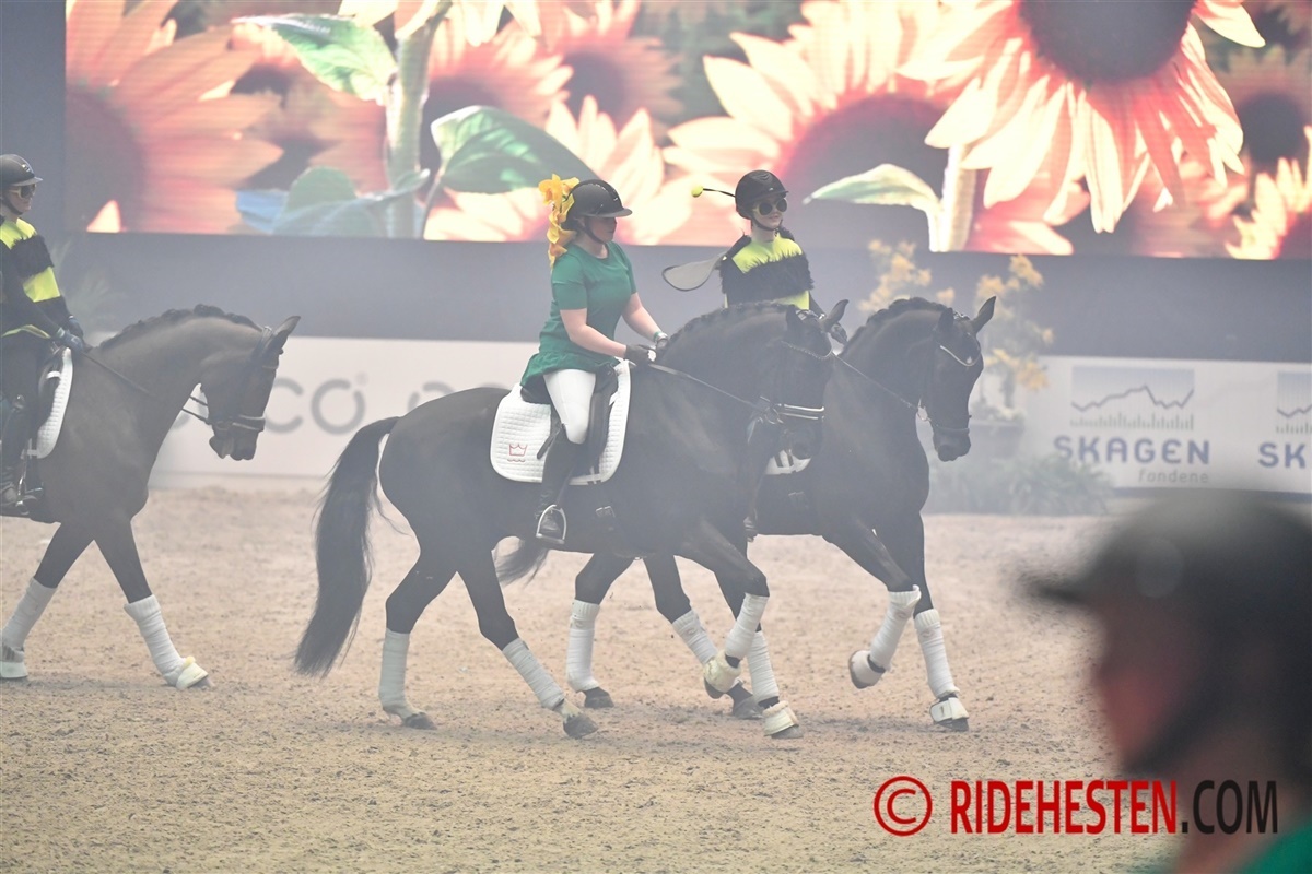 Der var ikke en eneste stol ledig, da gallashowet til Dansk Varmblods Hingstekåring her til aften blev trommet i gang af Copenhagen Drummers. Der blev klappet i takt til de danske beriderelever, der red kvadrille til sangen "Just Dance", mens de var klædt ud som bier og blomster. Og der blev piftet højlydt, da de fire unge mandlige ryttere fra Helgstrand Dressage i bar overkrop red ind, klædt ud som indianere.