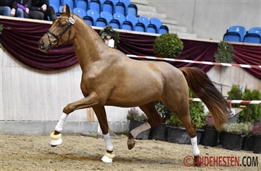 For 270.000 euro skiftede publikumsfavoritten kat.nr. 83 ejer og har fremtidig adresse i nordjyske Vodskov hos Helgstrand Dressage. Den besnærende chokoladefuks har igennem hele kåringforløbet vist sig meget overbevisende og var fra første dag publikums favorit. Hingsten er e. Quantensprung/ Stedinger/ De Niro og fremstår i et meget moderne og skarpt snit og har alle dage vist stort overskud og stor bevægelseskapacitet.