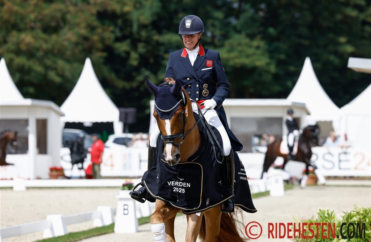 – Jeg er virkelig tilfreds med mit ridt i dag. Hun har kun gået et stævne i år, men gjorde det så godt, var totalt under mine hjælpere og havde fokus på mig til trods for, at hun jo stadig kun er syv, og der sker meget her. Changementerne var også supergode. Hun er bare en fornøjelse og så sjov at ride.