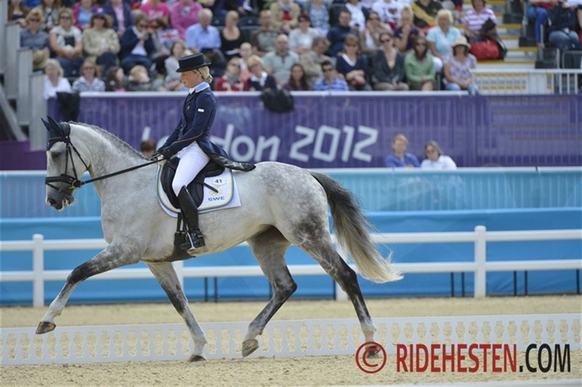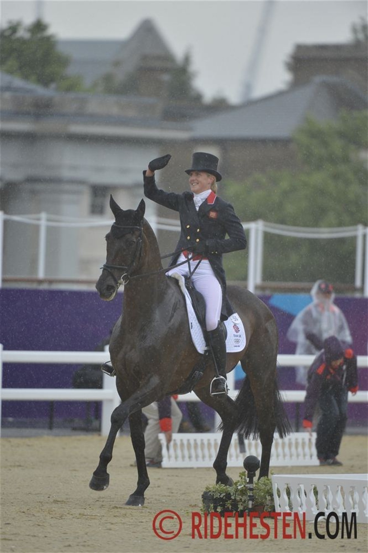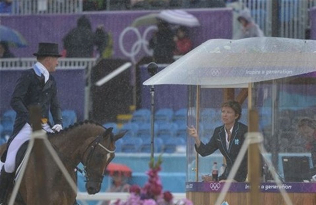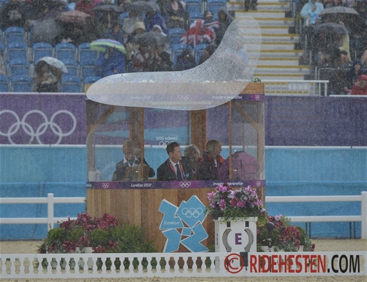 Regnen har hængt truende over OL stadion i Greenwich Park i dag, og da Englands Kristina Cook red på banen med Miners Frolic åbnede himlens sluser sig og regnen væltede ned over stadion. Dommertårnene er udstyret med en flot, eliseformet solskærm, og pludselig løsnede den ene sig ved dommer E og den flagrede op i luften. Det og regnen greb noget forstyrrende ind i Cooks program, men hun gennemførte top professionelt og jublen skyllede da også ned over hende, da hun hilste af. Overdommer Anne-Mette Binder fra Danmark besluttede, efter aftale med Niklas Lindback, der var næste rytter på banen, at udsætte hans start i 10 minutter for vældige tordenskrald rullede også over stadion. Ellers har dagens konkurrencer budt på et super ridt af endnu en svensk rytter, idet Sara Algotsson Ostholt (gift med den tyske militaryrytter og holdguldvinder fra Hongkong Frank Ostholt) fik præcist samme points 39,30, som den hidtil førende tyske rytter Ingrid Klimke. Holdkonkurrencen spidser til og det er nu Tyskland i front foran Australien og med Sverige på tredjepladsen her hvor der resterer 14 ryttere.