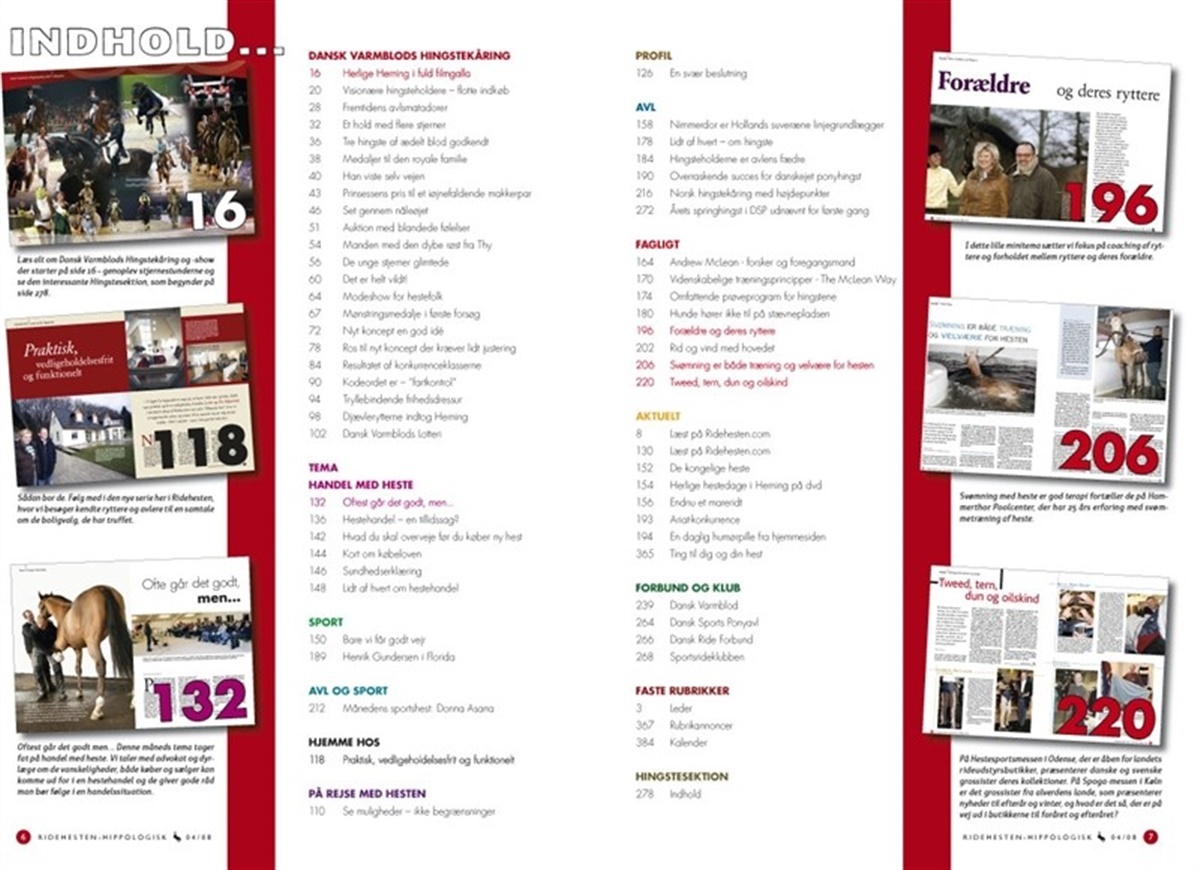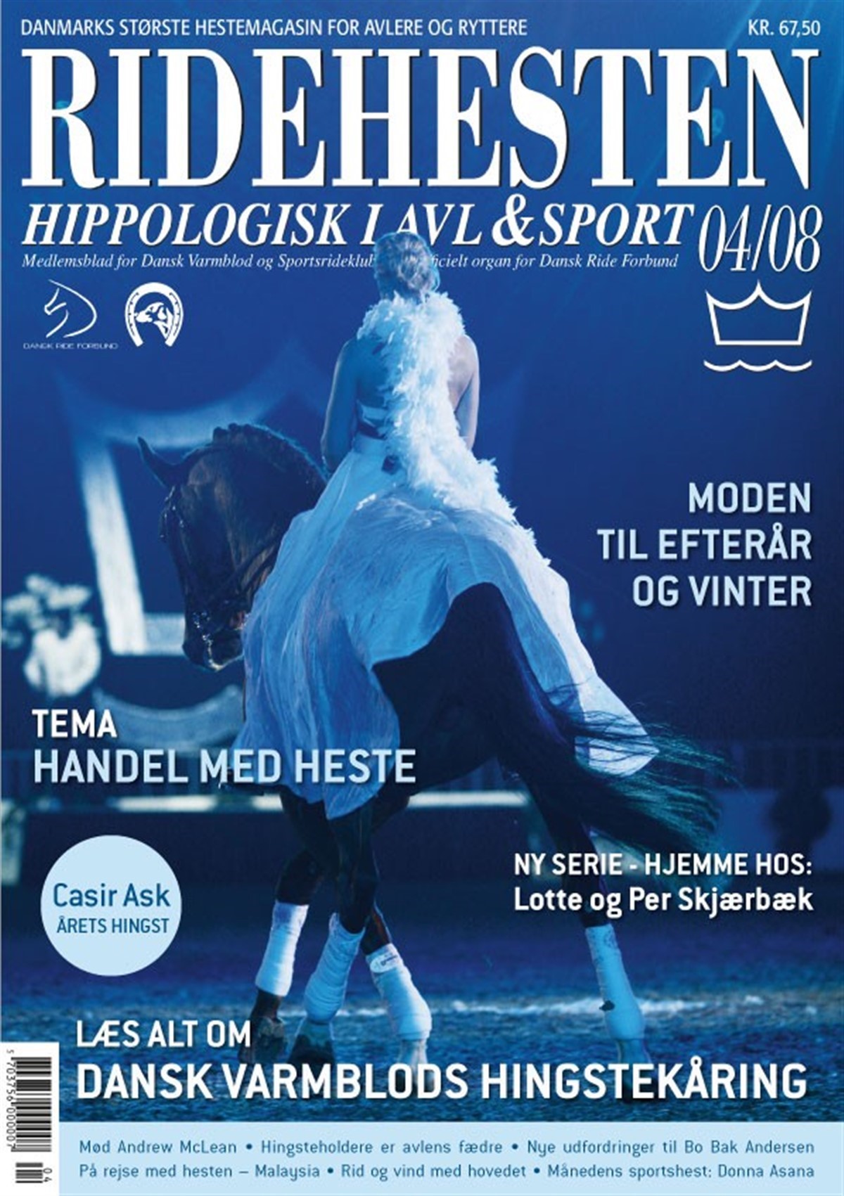 I april er det store hovedtema årets hingstekåring, og vi kommer rundt om alle de flotte shows og hestepræstationer flot krydret med spektakulære fotos. Udover hingstekåringen - som du får over 100 sider med!!! – stilles der skarpt på handel med heste og de forhold, du bør være klar over – bl.a. ses der nærmere på, hvordan du er stillet med købeloven. Der bringes også et interview med den velansete forsker Andrew McLean, en artikel om svømmetræning for heste, Nimmerdor – Hollands suveræne linjegrundlægger og om seminaret ”rid og vind med hovedet”. Der bringes et portræt af Bo Bak Andersen, som for nylig har taget den svære beslutning at opsige sin stilling som de danske ponyspringrytteres landstræner. I et minitema sættes fokus på coaching af ryttere og forholdet mellem rytter og forældre. Masser af produkter fra Hestesportsmessen præsenteres, og i den nye serie ”Hjemme hos”, som besøger kendte ryttere og avlere for en samtale om deres boligvalg, aflægges der i denne omgang besøg hos Lotte og Per Skjærbæk. Den imponerende hoppe Donna Asana er en af europæisk dressursports mest fremstormende unge talenter. Ridehesten har talt med opdrætteren, rytteren og hestepasseren, der opdagede talentet. Dette blot et udpluk af de mange informative og faglige artikler i rekordnummeret af Ridehesten, som lige nu er på vej til din postkasse. Du har god grund til at glæde dig dobbelt så meget! Har du endnu ikke abonnement på Ridehesten, så skynd dig at tegne det eller alternativt tegne medlemsskab af Dansk Varmblod - i maj følger der nemlig en flere timer lang, professionelt produceret, dvd fra hingstekåringen gratis med bladet.