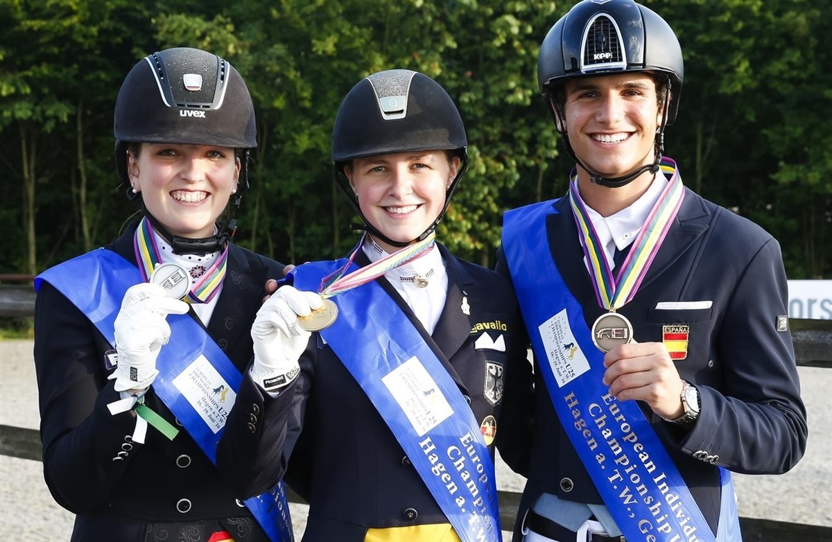 Det blev to tyske og en spansk rytter, som delte podiepladserne imellem sig i den individuelle medaljekonkurrence ved EM for U15 i Hagen. Guld og sølv lå sikkert på tyske hænder til Sanneke Rothenberger og Florine Kienbaum med spanke Juan Matute Guimon på bronzepladsen.