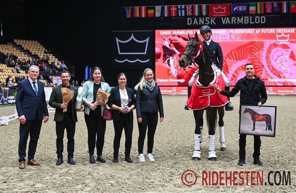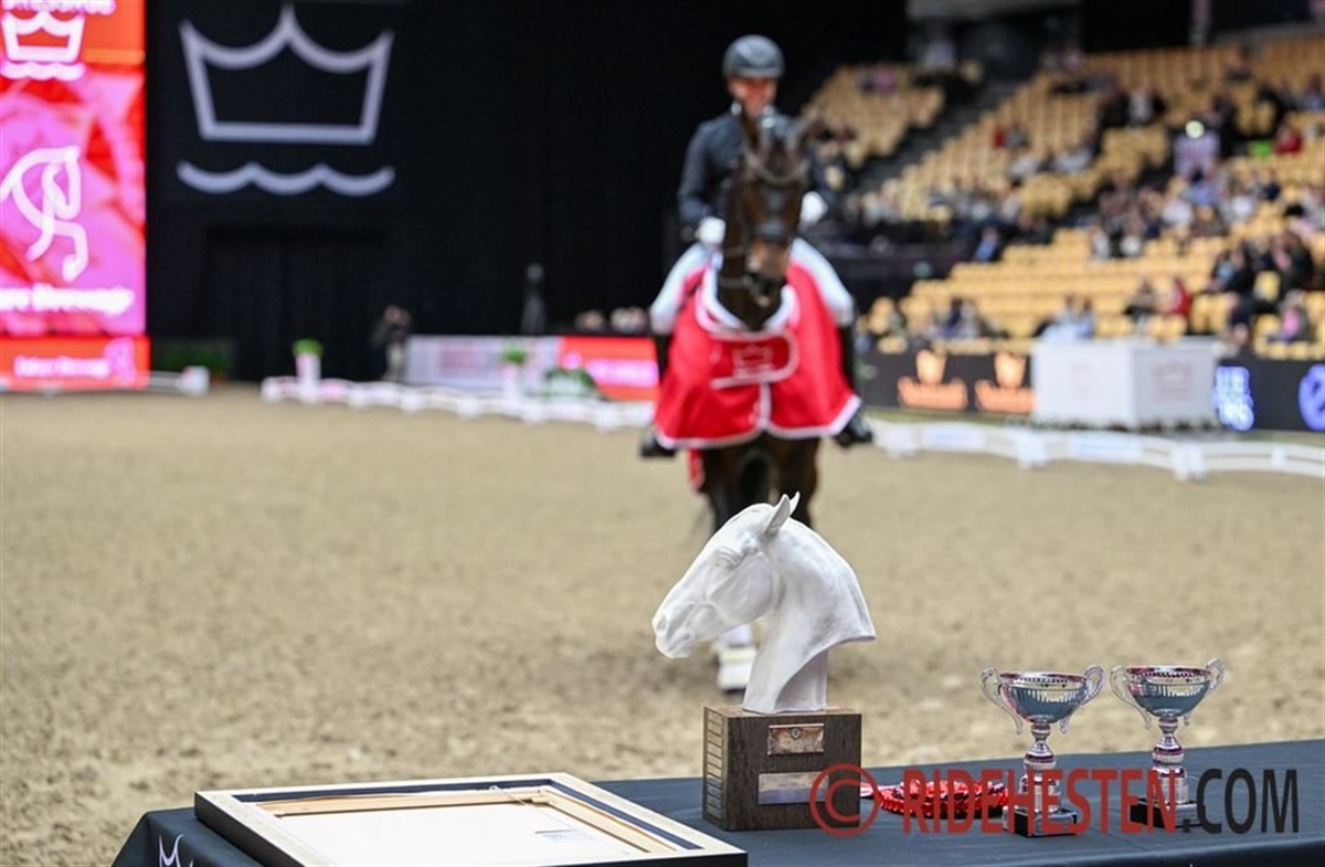 – Her blev han i 2016 godkendt i Dansk Varmblod og udnævnt til præmiehingst, og han blev i efteråret en særdeles overbevisende vinder af 35-dages materialeprøven med intet mindre end syv 10-taller og et resultat på fremragende 977,5 point. Efterfølgende præsterer han det ene flotte resultat efter det andet, og listen af meritter og titler vokser støt i en nærmest ubrudt række de næste mange år af hans særdeles flotte unghestekarriere, fortsatte talsperson for avlsledelsen i dressur, Vicky Nortvig, i sin præsentation af Årets Hingst, som blev fremvist af den portugisiske rytter Roberto Brasil inde i Jyske Bank Boxen lørdag eftermiddag.