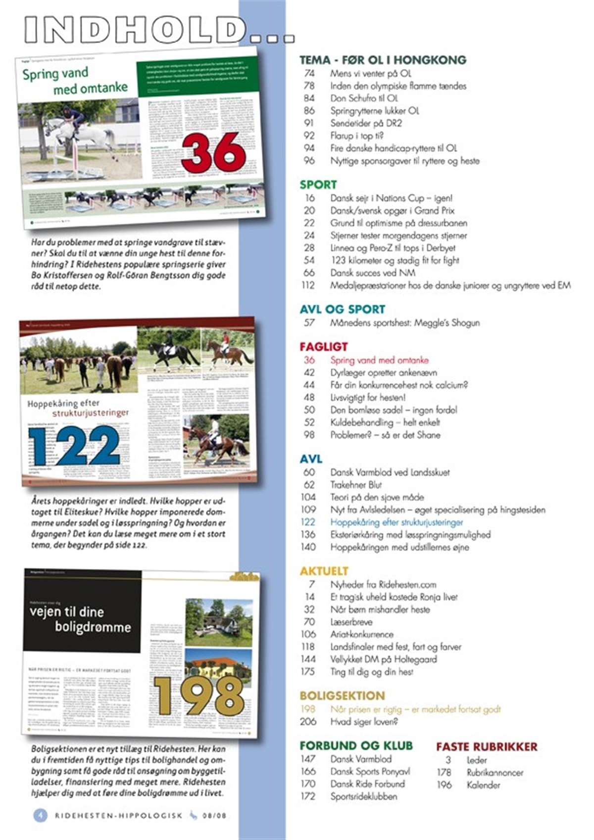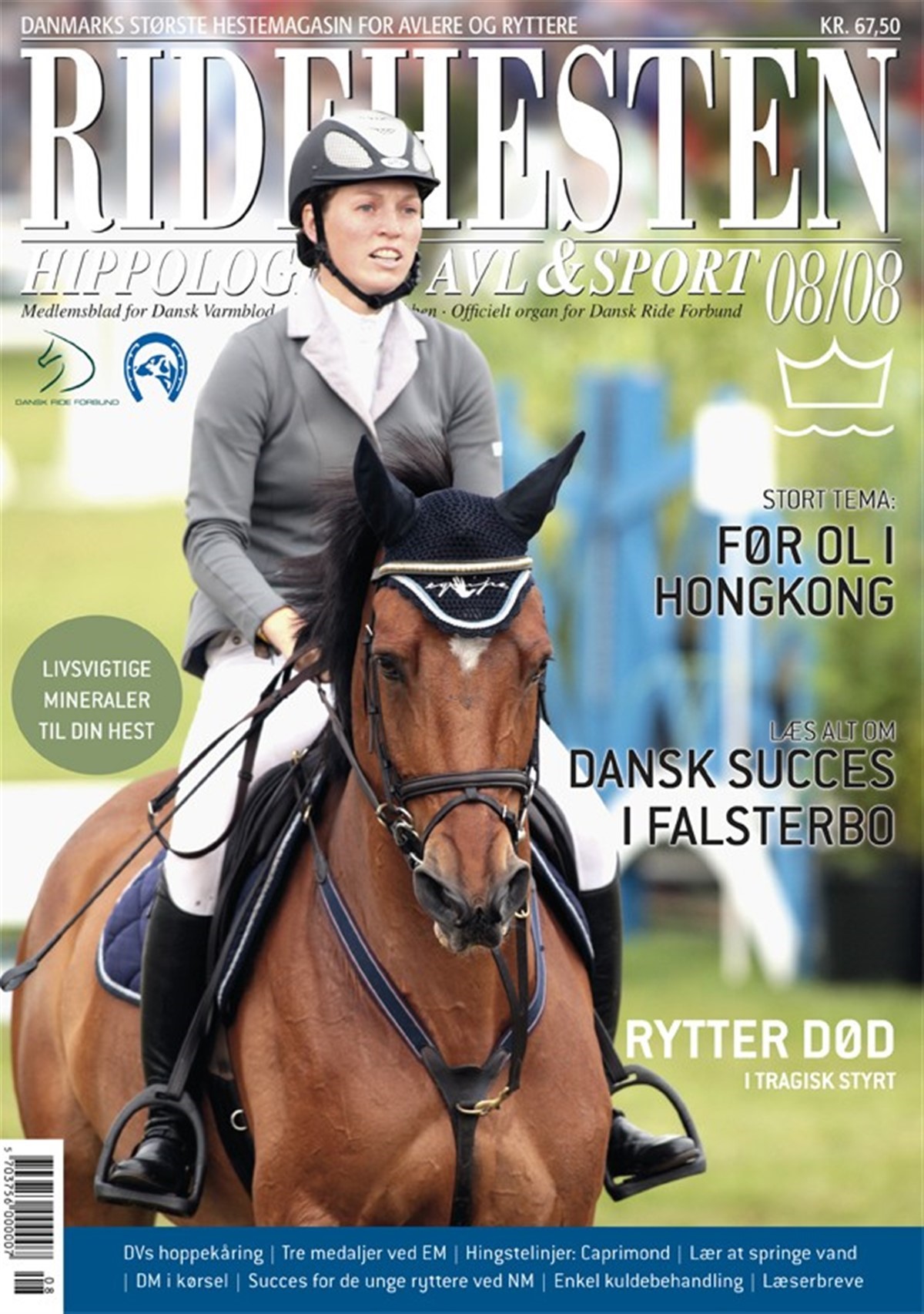 Knap 60.000 betalende tilskuere fulgte ryttere og heste under Falsterbo Horse Show i Sverige. I august måneds Ridehesten kan du læse meget mere om dette store stævne. Du kan også læse et stort tema om hoppekåringer og med Bo Kristoffersen og Rolf-Göran Bengtsson blive klogere på, hvordan en vandgrav springes. Vi tager temperaturen på boligmakredet – hvordan ser det egentlig ud? Får din konkurrencehest nok calcium ud af den foderration du giver den? Magnesium spiller sammen med kalcium også en meget vigtig rolle til muskelarbejdet. Bliv klogere herpå i to faglige artikler. Du kan læse mere om den norske rytter, Ronja Espejord, som for nylig døde tragisk under springtræning i Danmark. Høre om månedens sportshest, Meggle’s Shogun, DM i kørsel, om kuldebehandling, de unges NM og EM, som gav flere flotte medaljer samt høre om, hvordan skolebørn kan finde på at mishandle heste. I august-nummeret kan du også lige så småt begynde at føle OL-feberen brede sig, da der varmes op til årets helt store sportsbegivenhed med nogle relevante artikler. Dette blot et bredt udpluk af enkelte af månedens artikler. Vi ønsker dig rigtig god læselyst!