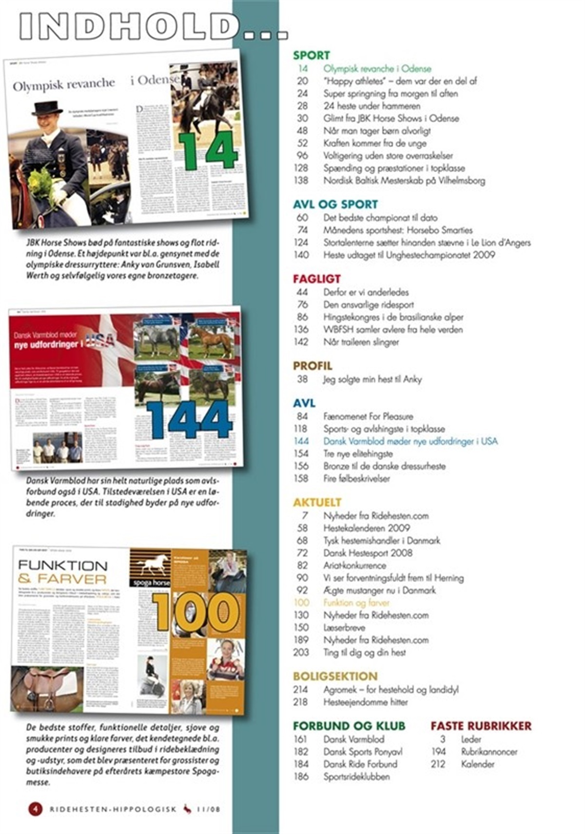 Ridehesten indeholder altid spændende og aktuelle, faglige artikler samt reportager fra de største stævner og kåringer. Novemberudgaven i år er ingen undtagelse, her kan du blandt andet læse en stor reportage fra World Cup i dressur ved JBK Horse Shows i Odense, hvor Isabell Werth fik revanche fra OL over Anky. Reportagen fra JBK omhandler også Grand Prix-springning, auktionen Danish International Sales, finalerne i dressurchampionatet for 4-, 5- og 6-års heste samt underholdende VIP-billeder fra showet. Derudover kan du læse om dressurrytter Charlotte Mogensens salg af sin dressurhest til Anky van Grunsven, der er reportage fra VM for ungheste i military og fra World Cup-kvalifikationen ved Oslo Horse Show, hvor de danske ryttere opnåede flotte resultater, og der er en stor artikel om de unge hingstes 35-dages test på Vilhelmsborg. I Ridehesten kan du også læse flere faglige artikler fra sportens og avlens verden samt de mest aktuelle nyheder fra hesteverdenen. Du kan supplere læsningen med alle billederne i billeddatabasen på Ridehesten.com samt se interviews med ryttere og uddrag af World Cup-ridningen samt 35-dages testen på WebTV. Rigtig god fornøjelse med Ridehesten og på Ridehesten.com.