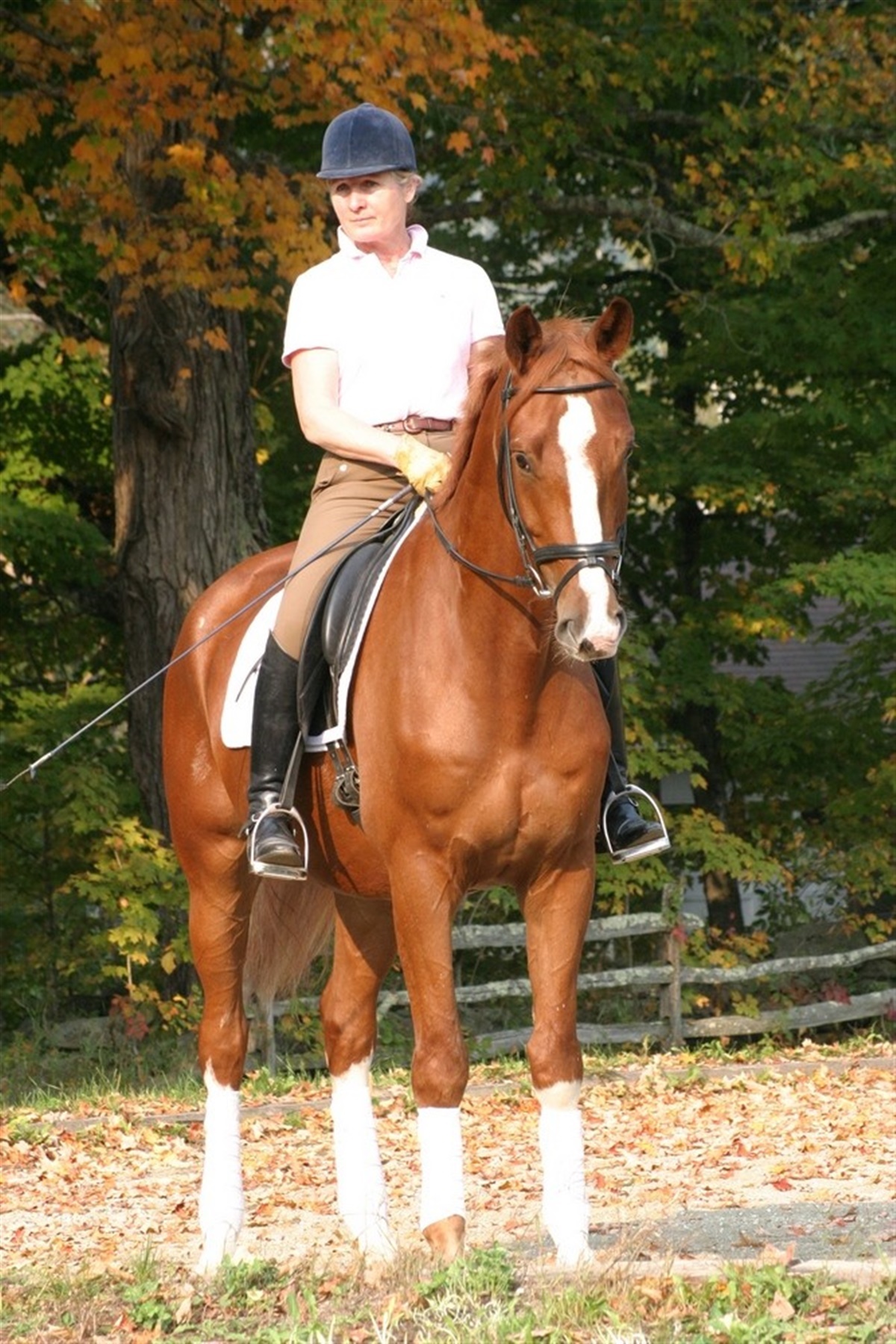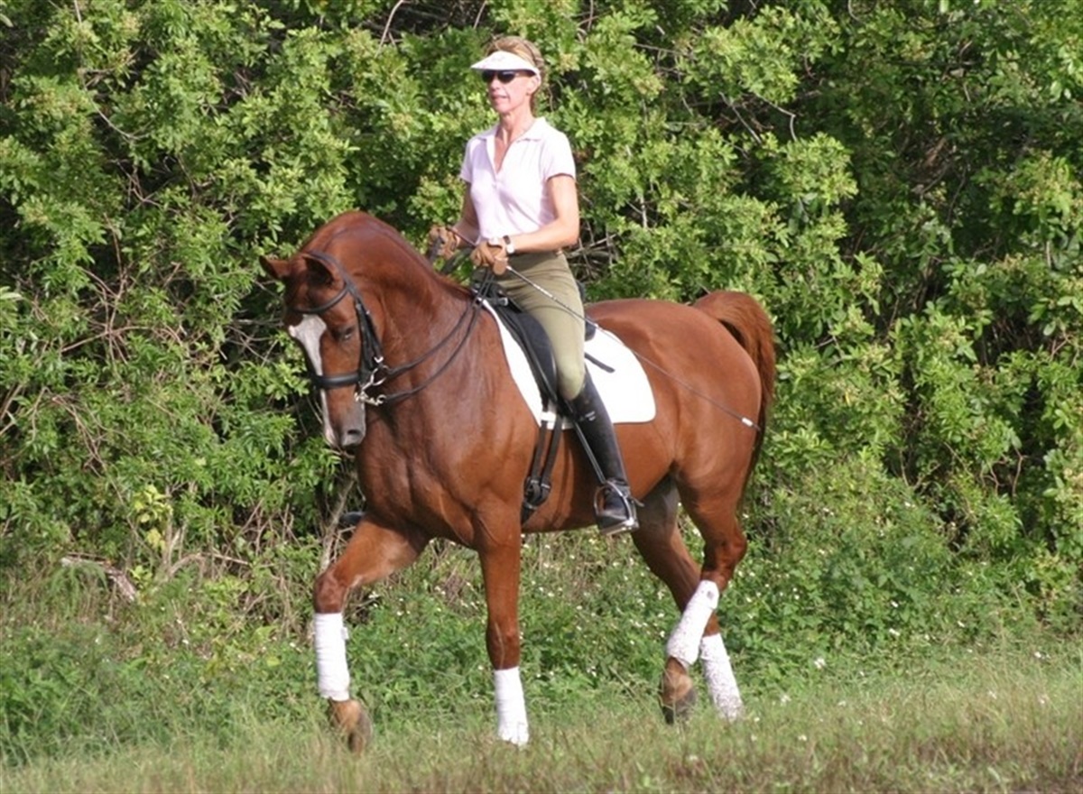 Milo Motts 7-årige Kontiki på morgentur ved flodbredden med sin amerikanske rytter Lynda Alicki. Kontiki hed i Danmark Ullerups Miller og er efter Milan/Ibikus. (Foto: ridehesten.com/TBJ)