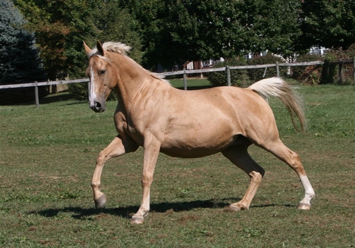I Pennsylvania mødes man af et særegent syn. En palominofarvet hoppe med DV-brand på låret. Alino Queen e. Michellino/Alibi er en helt speciel hest og fantastisk avlshoppe og måske er hun den sidste ægte DV-hoppe tilbage i hele verden med palominofarven? (Foto: ridehesten.com/ABO)