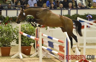 Udtrykket "at springe huse" får en helt bogstavelig betydning, når den danske skimmel Ferrero K sætter over en forhindring. Ole Strigels 5-årige vallak er e. Olympic Ferro og Frede Kroghs guldmedaljehoppe Colette e. Coronado. (Foto: ridehesten.com/TBJ)