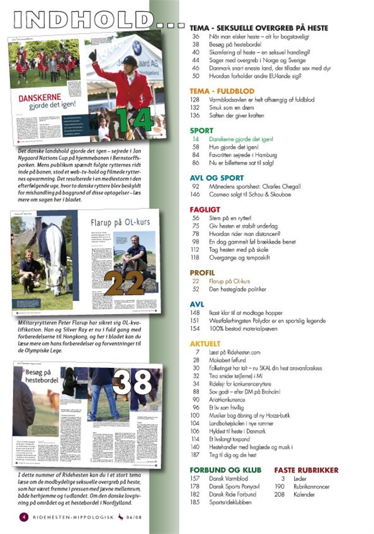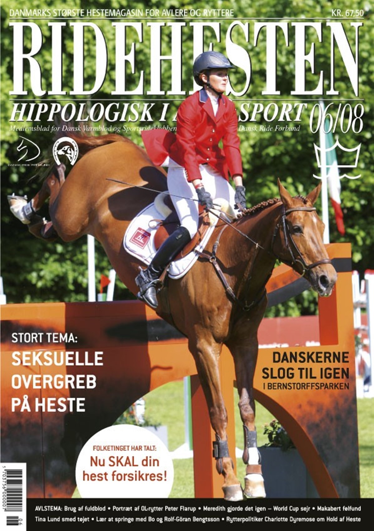 Tina Lund smed som bekendt det meste af tøjet i mandemagasinet M, og så gik bølgerne højt! Vi snakker med Tina om hele virakken. Bølgerne gik også højt efter et ellers vellykket CSIO-stævne i Bernstorffsparken. Flere danske ryttere blev anklaget for at have barret og mishandlet deres heste, og igen kom ridesporten i medierne for noget helt andet end de gode resultater. Vi kigger nærmere på sagen fra Bernstorffsparken, ligesom vi naturligvis også kigger nærmere på alle de flotte præstationer. Er hesten årsag til ulykke, når den er løs, er det nu dig som hesteejer, der er ansvarlig for at dække eventuelle skader. Vi sætter dig ind i den nye lovgivning. I et kæmpe tema stiller Ridehesten skarpt på det ellers ofte tabubelagte område: Seksuelle overgreb på heste. Vi snakker med dyrlægen, politikeren, psykologen og en, der har besøgt et såkaldt hestebordel. Det er chokerende læsning, som sætter på spidsen, at vi i Danmark er nødt til en klar lovgivning på området. I et tema kan du også læse om fuldblodshestene som forædlere, du kan læse om månedens sportshest Charles Chegall, og du kan læse om militaryrytteren Peter Flarups træning op mod OL. I månedens blad kan du lære at springe med Bo Kristoffersen og Rolf-Göran Bengtsson, ligesom du kan læse om alle de spændende resultater fra World Cup finalen i springning i Göteborg. Dette var blot et lille udpluk af alle de interessante artikler – vi ønsker dig god læselyst i det dejlige sommervejr!
