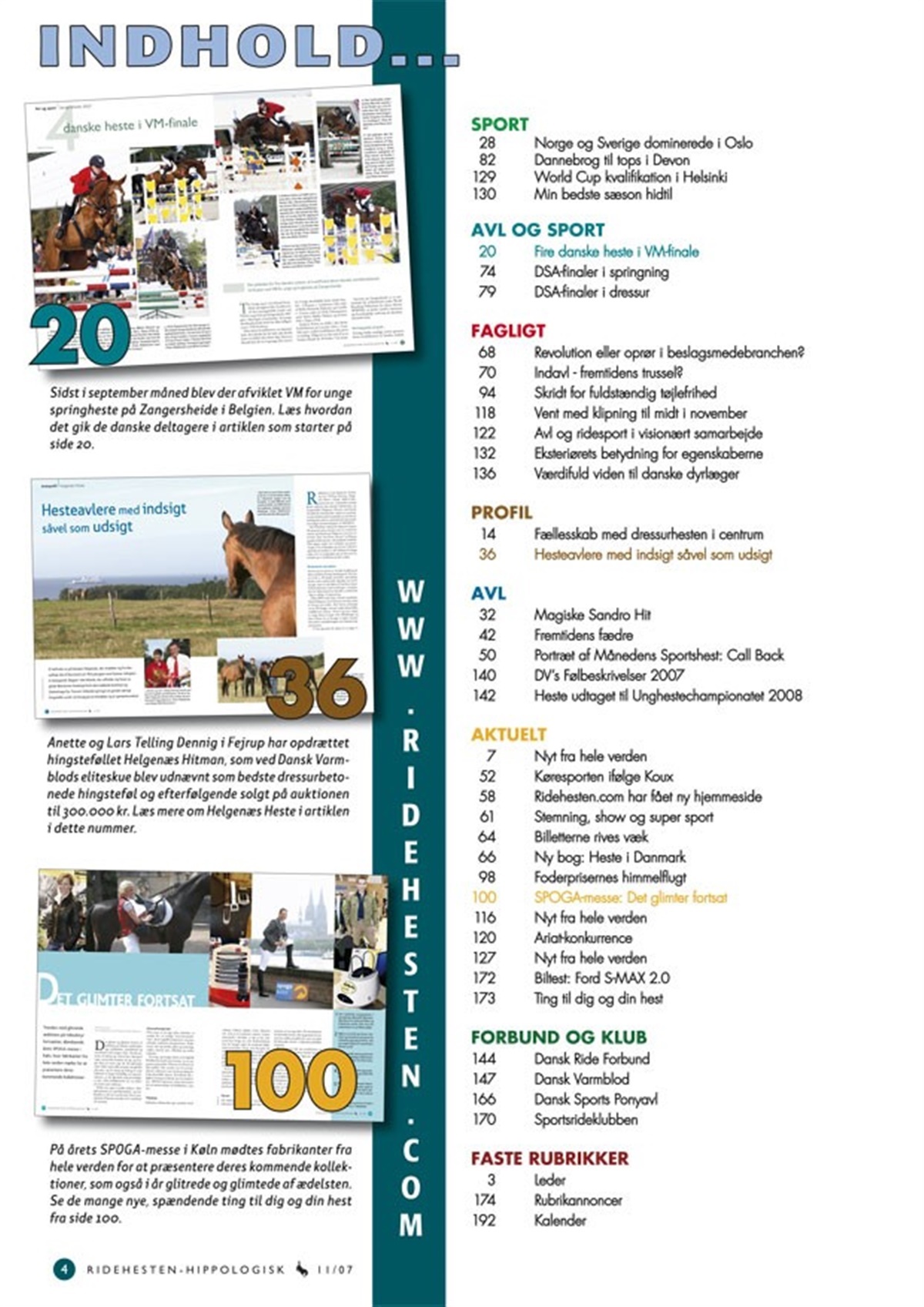 I det kommende nummer kan du bl.a. læse om Helgenæs Heste, som har opdrættet hingsteføllet Helgenæs Hitman, som ved Dansk Varmblods eliteskue blev udnævnt til bedste dressurbetonede hingsteføl. Årets SPOGA-messe i Köln bød på en masse glitrende udstyr – se i bladet det seneste nye, som messen havde at byde på til dig og din hest. Læs også, hvordan det gik de danske ryttere ved VM for ungheste i Zangersheide, om Oslo Horse Show, emnet indavl, arbejdet med at skridte hesten, Peter Koux’ syn på køresporten og om DSA-finaler på Vilhelmsborg. Ridehesten har også været en tur i USA, bl.a. til dressurstævne i Devon – se, hvordan det her gik de danske heste. Dette blot et udpluk af november måneds mange artikler. Vi ønsker dig rigtig god læselyst her i efterårsdagene!