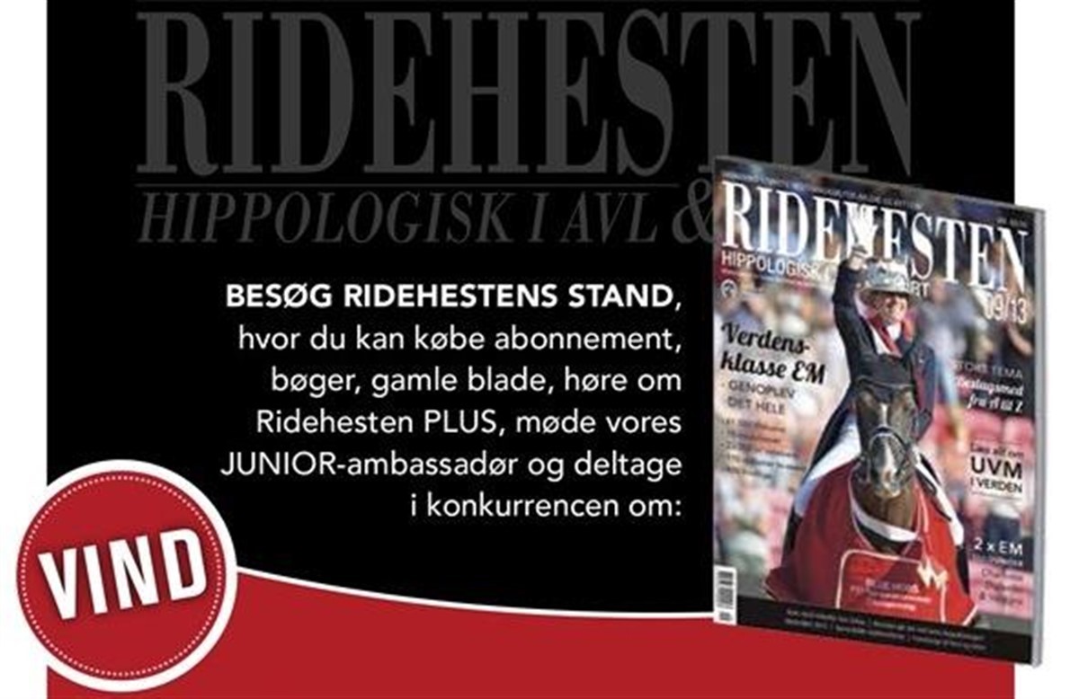 Både lørdag og søndag kan man besøge Ridehestens stand, hvor man kan købe abonnement, bøger, gamle blade, høre om Ridehesten PLUS, møde vores JUNIOR-ambassadører og deltage i konkurrencen om fede præmier.