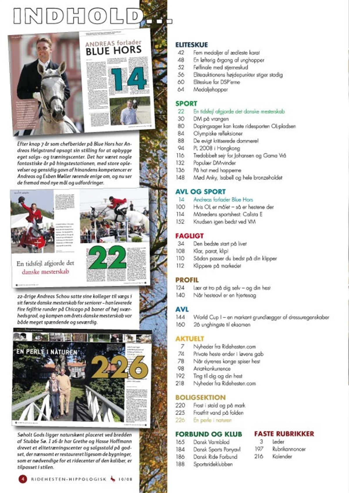 I oktober måned tager Ridehesten dig med til Dansk Varmblods Eliteskue på Vilhelmsborg - læs om alle de nyslåede medaljehopper, OL-bronzeholdets hyldest m.m. På Vilhelmsborg blev DM i springning samtidig afgjort – læs om alle de flotte præstationer – men også om de spekulationer, det igangsatte, da en vis rytterfamilie satte spørgsmålstegn ved springbanens kvalitet. Vi tager også pulsen på OL-dopingsagerne og gør status. Måske risikerer vi på sigt at miste ridesporten som OL-disciplin? Blue Hors stutteriets chefberider Andreas Helgstrand har som bekendt besluttet at etablere egen virksomhed under navnet Helgstrand Dressage A/S, og han forlader derfor sin stilling på Blue Hors. Vi bringer et stort interview med begge parter, der fortæller om den svære beslutning – og de nye muligheder. Du kan få tip til klipning af hesten samt til vedligeholdelse af klippegrejet. Komme med til DRF’s Championat for Ungheste, VM på Zangersheide og få et kig hjemme hos Grethe og Hasse Hoffmann på Søholt Gods. Du kan også bl.a. læse en artikel om handicaprytternes præstationer ved deres OL: de paralympiske lege, om heste som løvefoder, om DM i distanceridning og om stutteri Gasbin. Og så er der selvfølgelig et hav af andre spændende artikler om heste, ryttere og forskellige ridepræstationer! God læselyst her i efteråret! Står du og mangler en julegave til en bekendt? Eller mangler du selv et julegaveønske? Så var et abonnement på Ridehesten måske en idé? Det kan nemt bestilles over nettet - se mere via linket!