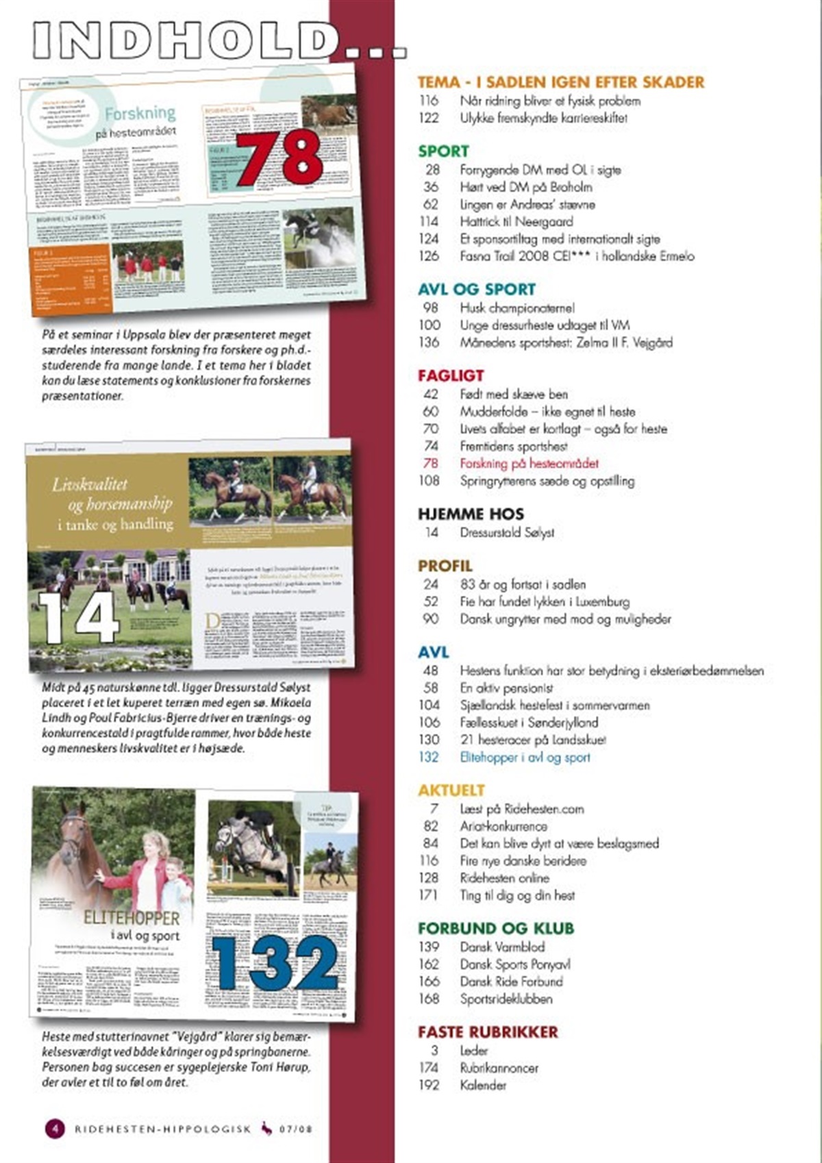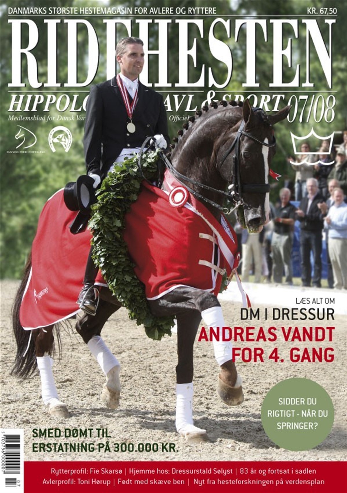 Det helt store emne i Ridehestens julinummer er årets dressur-DM for seniorer på Broholm Gods. Andreas vandt som bekendt for 4. gang - dette samt masser af informationer om flere af de andre rytteres præstationer kan du høre om i en stor stævnereportage fra Broholm. Du kan også læse om en sag, hvor en dansk smed er blevet idømt en erstatning på 300.000. Smeden, som er fra Nordsjælland, er efter seks års tovtrækkeri med flere retsinstanser blevet dømt til at erstatte en tilskadekommen pony. Du kan også i en springserie med Bo Kristoffersen og Rolf-Göran Bengtsson få vejledning omkring din opstilling under springtræningen. Rytternes springstil er næsten lige så varieret, som antallet af springryttere i sporten (se web-tv med Bo Kristoffernes 'teaser' til artiklen). Men ét gælder altid: Rytteren skal hele tiden være i balance og harmoni med hesten. Du kan også læse en rytterprofil af Fie Skarsøe, som er 31 år og uddannet tandlægeklinikassistent. Trods dette har hun for længst gjort ridning til sin levevej og længe før sine studier vidst, at det i den sidste ende ville komme til at dreje sig om dressur. Et emne i juni er også skæve ben hos føl – en vækstforstyrrelse, der af og til ses hos de nyfødte føl. Det viser sig, at den sidste tredjedel af hoppens drægtighed har betydning i den sag. Du kan også læse om de udtagne danske ungheste til VM i Verden, om månedens sportshest Zelma II F. Vejgård, komme med på besøg hjemme hos Mikæla Lindh og Poul Fabricius-Bjerre på Dressurstald Sølyst, høre om elitehopper fra stutteri Vejgård og meget meget mere. Dette var blot et lille udpluk af alle de mange forskellige artikler i månedens Ridehesten. God læselyst og god sommer!