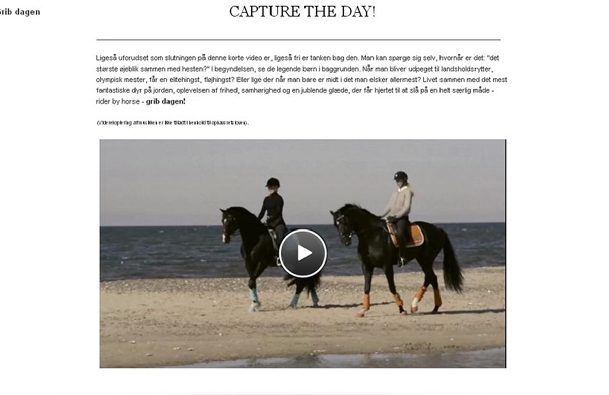 Riber by Horse tager med deres nye video "Grib dagen" hul på et helt nyt markedsføringskoncept i præsentationen af deres forårs- og sommerkollektion 2013. I videoen møder Rider by Horse's vante poetisk smukke stil det dramatiske og uforudsigelige. Klipning, musik og tekst spiller fint sammen. Looket er rent og enkelt, men små deltaljer fanger øjet. Med produkterne bevæger vi os i grænseområdet mellem klassiske og visionære farvespil, der på en gang er både nedtonet og sprælsk. Ligeledes er markedsføringen på en gang klassisk - i form af de skrevne ord - og visionær i form af anvendelsen af videomediet.