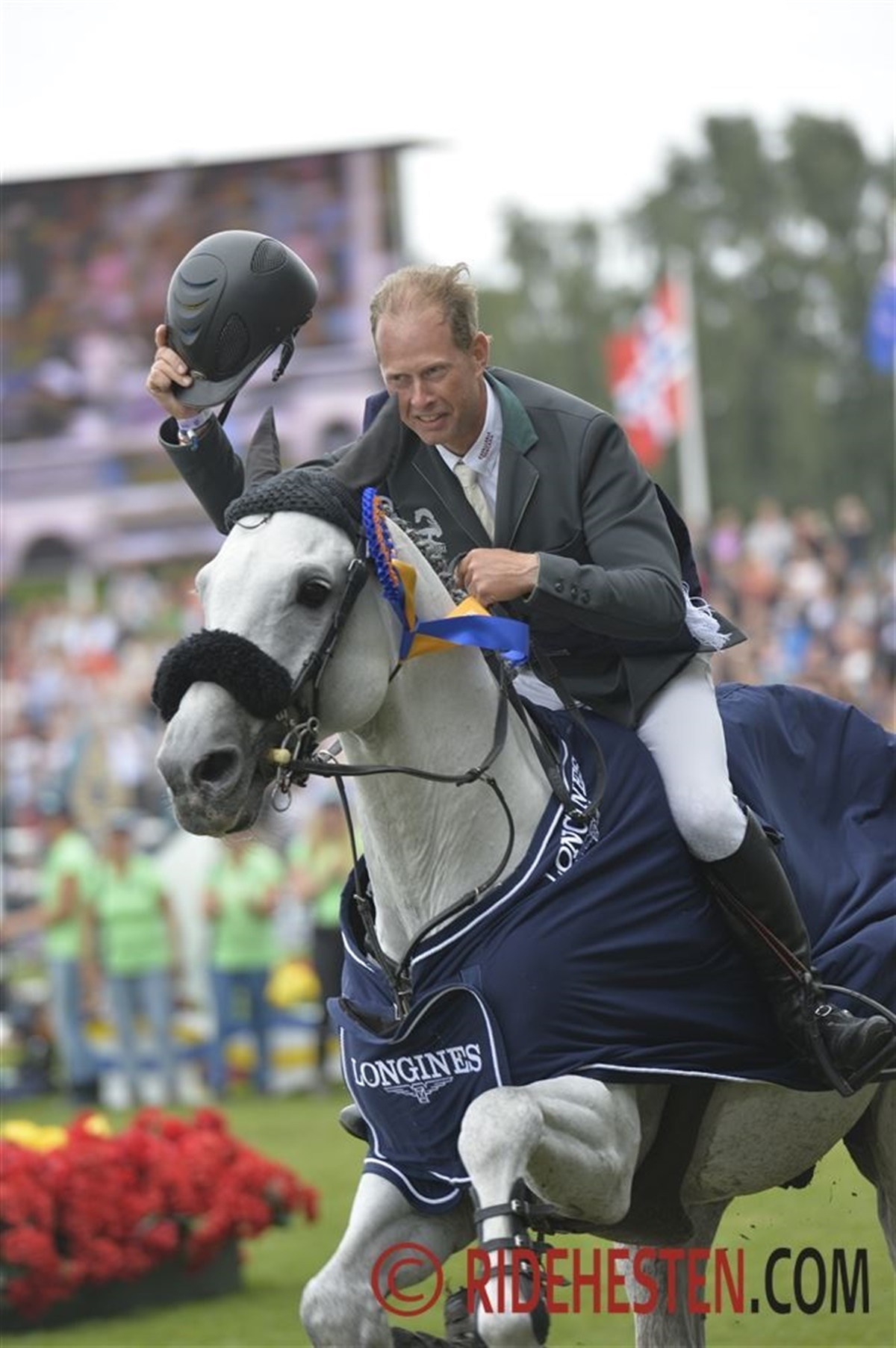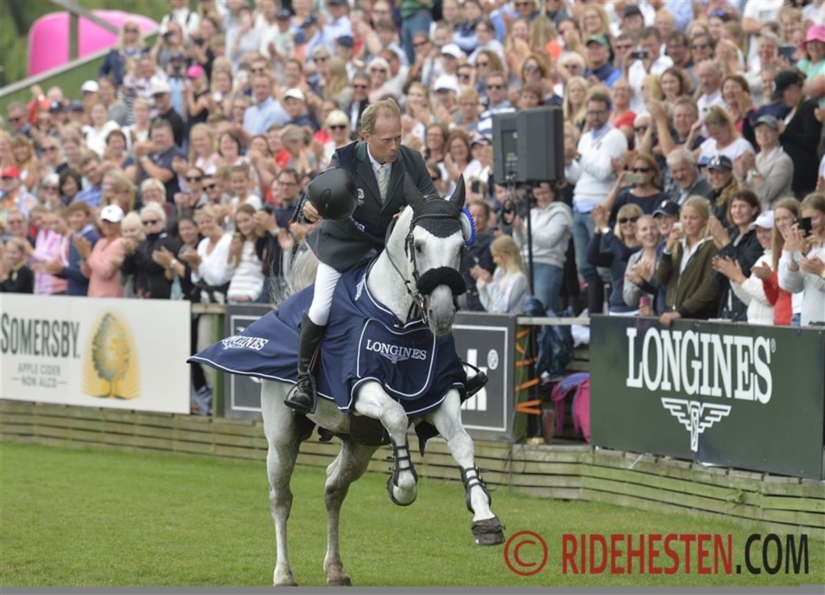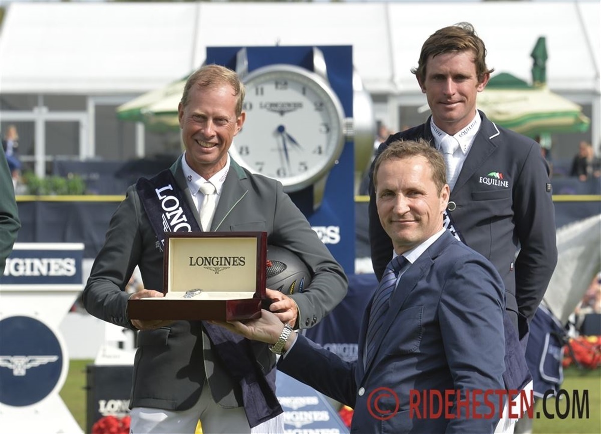Det var en velfornøjet Rolf-Göran Bengtsson som mødte pressen efter sejren i Longines Grand Prix hvor han samtidig, igen fik overrakt det flotte Longines ur fra den danske direktør for Longines Casper Gebeke.
