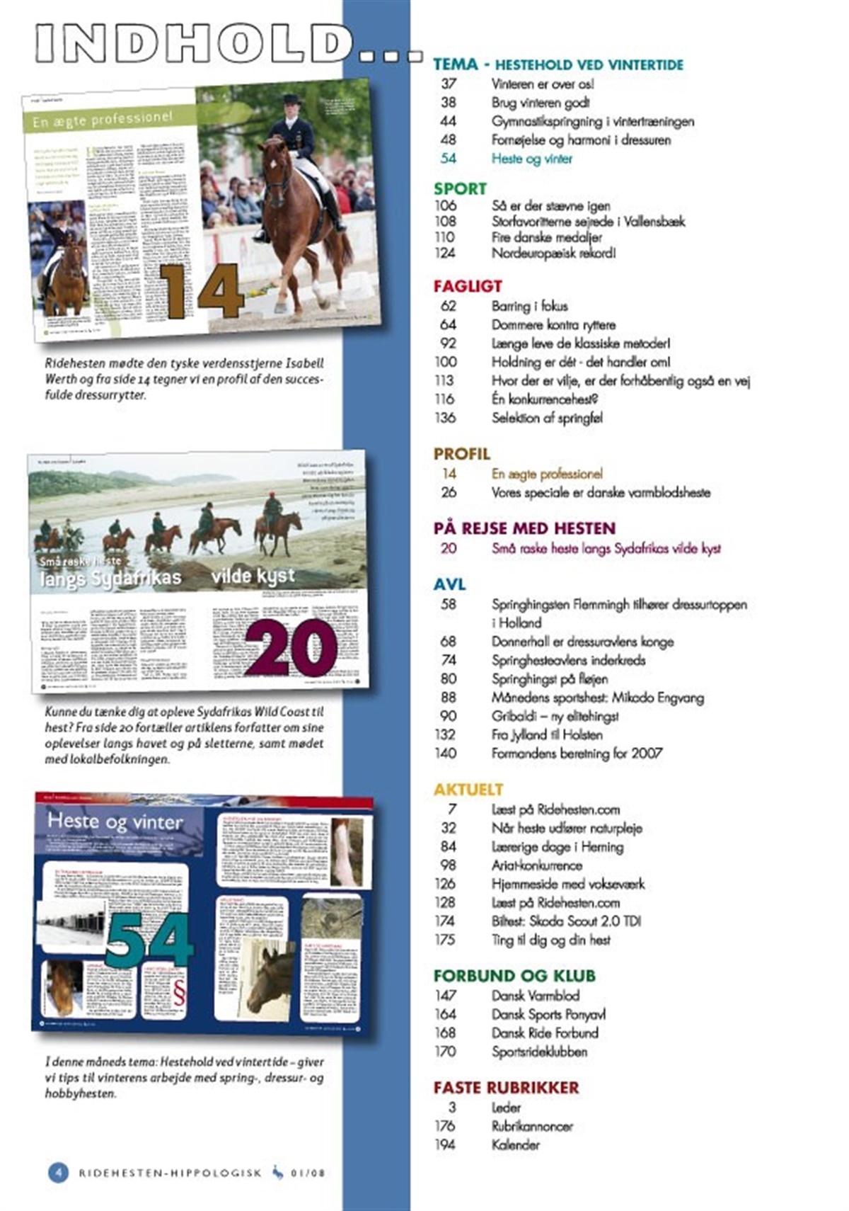 Ridehesten er i januar som sædvanlig et bredt mix af faglige, aktuelle, avls- og konkurrencerelaterede artikler. Du kan bl.a. følge med i en flot og anderledes ridetur langs Sydafrikas vilde kyst, få et portræt af den tyske dressur verdensstjerne Isabell Werth, blive klogere på hestehold om vinteren ved bl.a. at få gode råd vedrørende den indendørs vintertræning - hvad end det drejer sig om dressur eller springning. Vi bringer et stort tema om hestehold ved vintertide. Du kan også læse om et forsøgsprojekt, der har kørt over en 2-årig periode med græsning af islandske heste på Mols Bjerge. Du kan også læse om springhingsten Flemming, der tilhører dressurtoppen i Holland, og om månedens sportshest: Mikado Engvang. Dette var blot et lille udpluk - du kan glæde dig til meget mere relevant hestestof i Ridehesten januar. Vi ønsker dig rigtig god læselyst (og træning) i den mørke vintertid!