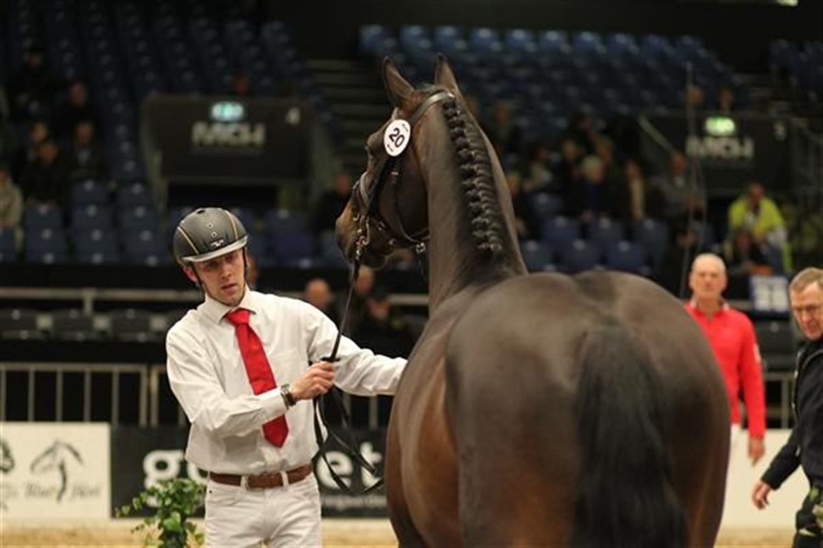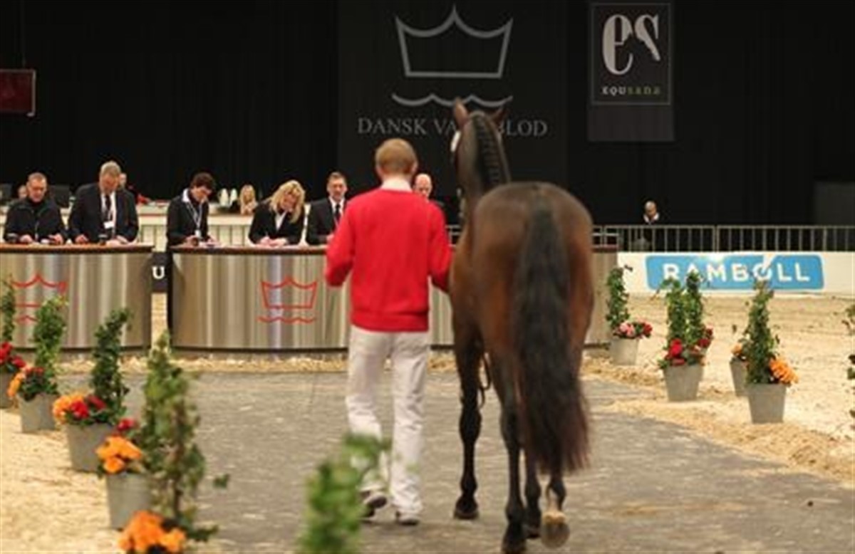 De treårige hingste tramper afsted på asfalt bunden op mod dommerne her til formiddag. Bunden er lagt i hal B af NCC, så både dommere og tilskuere kan nyde at se hingstene indendørs. Dommerne vurderer hingstenes benstilling, type og takten i bevægelsen under dagens bedømmelser. De kommende dage skal hingstene mønstres, vises løse, longeres og for springhingstenes vedkommende også løsspringes, inden dommerne lørdag middag afslører, hvilke hingste der opnår adgang til afprøvning og dermed potentiel kan udvikle sig til at få status af avlshingst i forbundet efter bestået materialprøve.