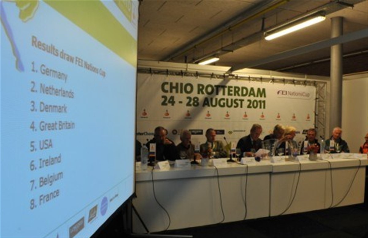 Frankring har vundet Superligæn de seneste to år, i dag har franskmændende det held, at de skal starte sidst i nationsspringningen. Franskmændende har vist uventet svag form i denne sæson, og dermed er Frankrig blandt de tre nationer, der kan risikere at følge Danmark ned i Promotional League i 2012. Startrækkefølgen iden ottende etape af serien er som følger: 1, Tyskland, 2, Holland, 3, Danmark, 4, Storbritannien, 5, USA, 6, Irland, 7, Belgien, 8, Frankrig . Og der er masser af spænding i luften forud for det endelige sammenstød. Reglerne dikterer, at efter den sidste af de otte kvalifikationsstævner i Superligane bliver de to lavest placerede nationer degraderet til Promotional leage. Og de lande, der i de fleste fare for at følge danskerne ud af den bedste række er amerikanerne og belgierne. Men efter den foregående runde i Dublin (IRL) for tre uger siden, er franskmændene kun fire point foran Belgien. Hvis de oplever endnu en dårlig dag i dag, er det land, der har domineret sporten i nations cup for de sidste to sæsoner i en meget sårbar situation. Den danske landstræner Achaz von Buchwaldt ved, at der ikke er nogen måde for hans side for at rette op på den situation, de befinder sig i. Danskerne har kæmpet for at hæve deres niveau i denne sæson. Achaz mener, at det har været en gavnlig oplevelse. "Det var en god chance for vores hold, selvom vi havde en vanskelig tid, fordi vi ikke har så mange heste" forklarede han. I modsætning hertil er Tysklands Otto Becker optimistisk for hvad dagen kan bringe. "Vi har en lille chance for at vinde serien" påpegede han, "og hvis vi får muligheden, så vil vi tage den!" Med Marco Kutscher, Thomas Voss, Carsten-Otto Nagel og Ludger Beerbaum på holdet, vil de førende hollændere være nødt til at forblive blive skarpe, hvis de skal sikre titlen i dag. Tyskland ligger kun fire point efter Holland, og er a points med holdet fra Storbritannien. George Morris ved, at amerikanerne kan risikrere at skulle vinke farvel til superligadeltagelse. USA ligger næstsidst og de skal producere noget særligt, hvis de skal redde dagen. "Vi har haft masser af gode ryttere på holdet i år, men vi havde ikke nok dybde. Vi har elsket at være i den bedste liga, men hvis vi går ned, så vil vi kæmpe for at komme tilbage. Han stiller med at formidabelt rent kvindehold: Beezie Madden, Lauren Hough, Christine McCrea og Laura Kraut og de vil ikke gå ned uden en hård kamp. Manden med de mindst at bekymre sig om, er hollandske Chef d'Equipe Rob Ehrens. Han påpegede dog, at det kommende FEI EM i Madrid er vigtigste prioritet. "Men vi vil gerne vinde i på hjemmebane", sagde han, og få de € 100.000 i præmiepenge der er på spil til det vindende hold. Finalen kan følges live på FEI tv fra kl. 17.15.