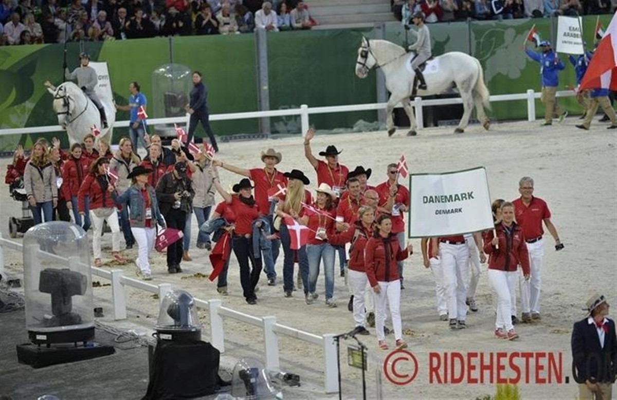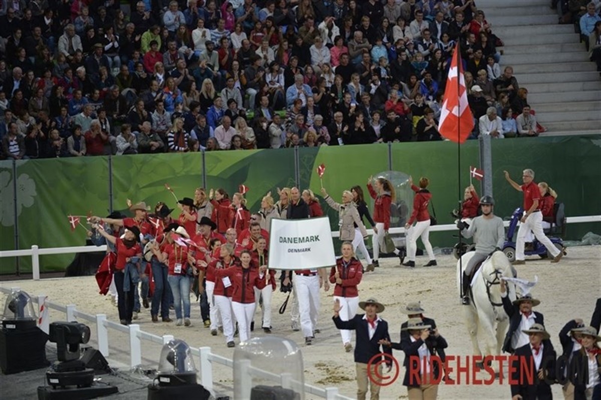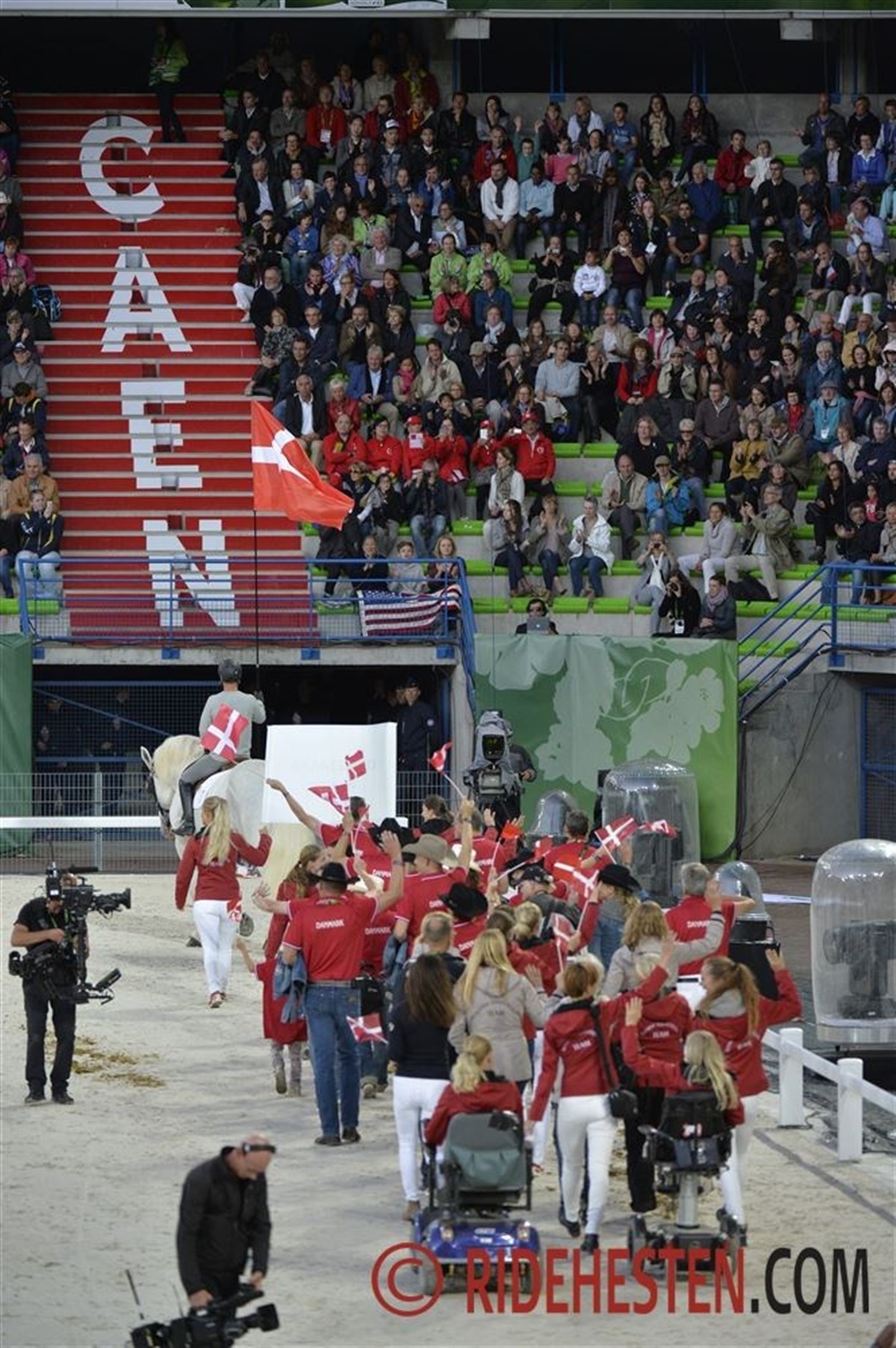 En festlig åbningsceremoni startede WEG i Normandiet, og danskerne var en del af den festlige indmarch. Det var Mikala Gundersen og Anna Kasprzak der bar det danske skilt foran den danske delegation. 74 nationer gik ind på stadion her til aften.