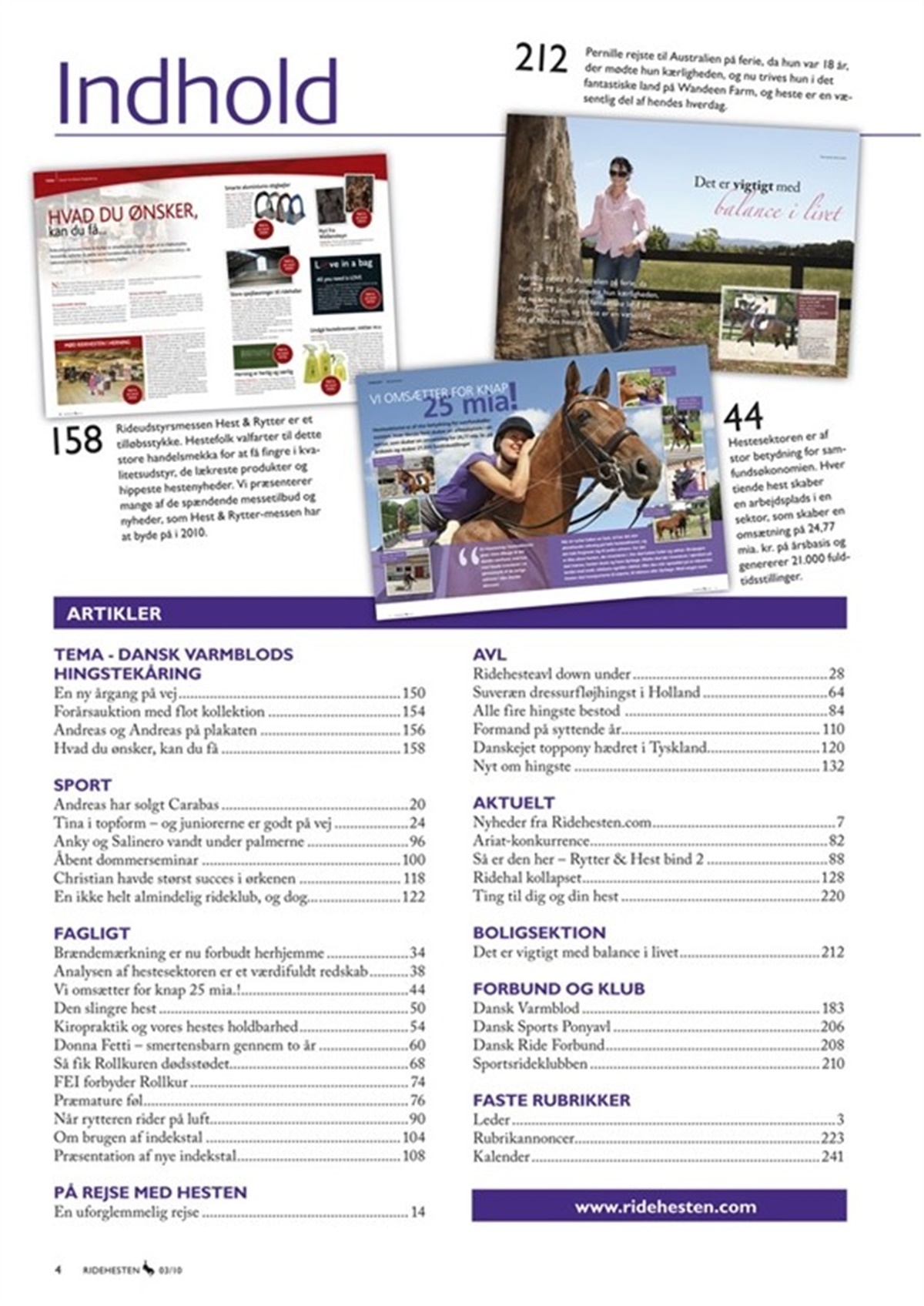 Ridehestens marts-nummer sætter fokus på Dansk Varmblods hingstekåring og mange af de spændende nye produkter på Hest & Rytter-messen. Derudover kan du blive meget klogere på FEI’s nye regler for træningsmetoder, og igen i dette nummer tager vi dig med "down under". Du kan også læse om Danish Derbys internationale springstævne på Vilhelmsborg. Du kan også bruge dykke ned i den omfattende analyse, som Landscentret | Heste har lavet på hestesektoren. Vi giver i et stort tema en fyldig guide til Hest & Rytter-messen i Herning den 11. – 14. marts, hvor du blandt andet kan opleve hingstekåring, specialarrangement med 2 x Andreas, gallashows og besøge Ridehesten og Dansk Ride Forbund. Du kan også læse historien om Brovst Rideklub, hvis ridehal kollapsede i vintervejret - mens der var heste og ryttere til stede! Andreas Helgstrand taler også ud om sit salg af Carabas, ligesom du kan læse om rollkuren der på papiret nu har fået dødsstødet. På Dansk Ride Forbunds sider i Ridehesten kan du læse om forbundets repræsentantskabsmøde, der finder sted i Kolding den 20. marts. Du kan også blive klogere på de danske rideturneringer, der allerede er i fuld gang, og du kan få et overblik over de mange spændende kurser, som Dansk Ride Forbund udbyder i foråret.