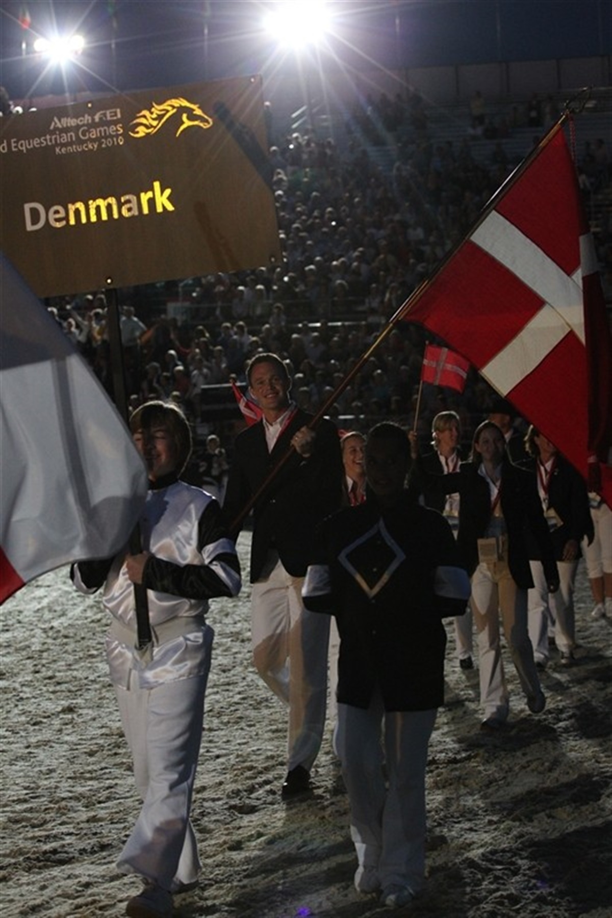 I knap fire timer blev publikum underholdt på det store stadion i Kentucky ved åbningen af World Equestrian Games. Der var ingen tvivl om, at vi var i USA for underholdningen omfattede indianere, cheerleaders, western ryttere, american sadelbreds med meget mere. Det hele bundet sammen af et stort orkester suppleret med kendte, bands, contrysangerinder og opera ditto. De danske ryttere og holdledere blev ved indmarchen ført an af Sune Hansen, der var fanebærer. Læs mere om åbningen og se flere fotos i magasinet Ridehestens november udgave.