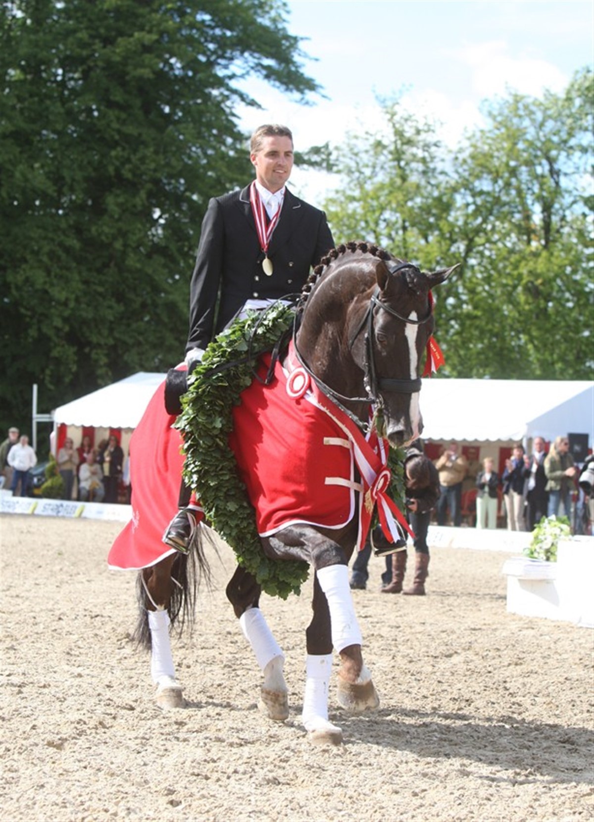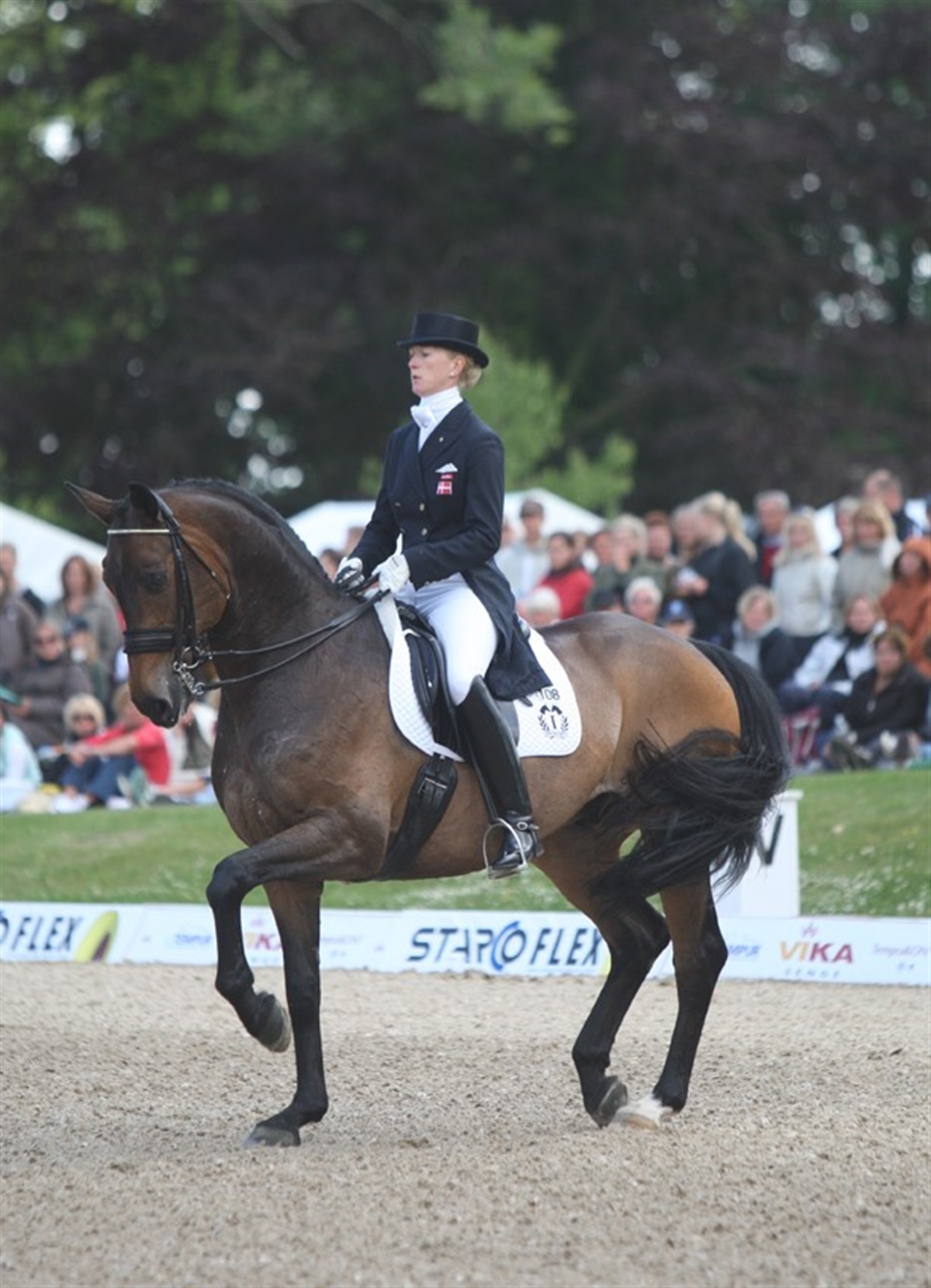 Solen strålede ned over Broholm Slotspark i dag og badede deltagerne i DM-finalen i lys - der var også fuld fokus på rytterne fra de tusinder tilskuere, som sad tæt på tribunerne eller camperede i græsset. Andreas Helgstrand var storfavorit til sejren i dag med 15-årige Don Schufro efter to klasseridt i Grand Prix og Grand Prix Special, men der var kun 0,7% mellem Nathalie zu Sayn Wittgenstein og Anne van Olst på henholdsvis anden og tredjepladsen. Andreas Helgstrand kunne ingen røre, heller ikke i dag, hvor han scorede 79,7% efter et ridt med flotte passage/piaffe øvelser og et super galopprogram, et par enkelt små kiks skæmmede ikke præstationen i sin helhed, og publikum rejste sig og klappede taktfast da han og Don Schufro skridtede ud af banen - elegance, kraft og lethed ved øvelserne er i høj grad det der kendetegner avlshingsten, som har betydet så umådelig meget for dansk avl og ridesport, hingstestation Blue Hors og ikke mindst Andreas Helgstrand. Han udbrød spontant, da han kom ud af banen: - Det her har jeg ventet på i 5 år. For 5 år siden blev han og Don Schufro nr. to i det danske mesterskaber og selvom Andreas har vundet mesterskabet hvert år siden på Cavan, Matine og Gredstedgaards Casmir, så har han glædet sig til at gøre arbejdet færdigt med Don Schufro og sidde på hingste som vinder af mesterskabet. De mellemliggende år har hingsten døjet med skader, men i år var han fit og sund - og det demonstrerede han tydeligt på Broholm. Prinsesse Nathalie måtte ud i et svært valg mellem Digby og Rigoletto, da hun skulle vælge sin partner til kürfinalen - valget faldt på Rigoletto, idet den kür som prinsessen har redt i vinter, på Digby, rent faktisk er Rigolettos, og den passer til hestens imponerede passage, flotte piaffer og i det hele taget det fremragende grundarbejde, som Nathalie har lagt i hesten fra unghest og frem mod Grand Prix. Med 75,6% placerede hun sig 0,6% foran Anne van Olst og Clearwater, og dermed blev rækkefølgen i mesterskabet fuldt fortjent, understregede Anne van Olst, som var meget tilfreds med sit danske mesterskab og samarbejdet med den danske varmblodsvallak, som hun kun har redet i et halvt år. Anders Dahl og 18-årige Afrikka er sidste mand på det bruttohold, som nu skal rejse mod det store internationale stævne i Aachen, hvor landstræner Rudolf Zeilinger skal udpege de tre ryttere, som skal deltage for Danmark ved OL i Hongkong. Han udtrykte stor tilfredshed med standarten og stabiliteten hos de danske topryttere, en standard, som aldrig har været så høj som nu. Han er meget postiv og optimistisk både i forhold til de danske medaljechancer i Hongkong, men også på vegne af dansk dressursport som helhed. Don Schufro eller Casmir? Spekulationerne om hvilken hest Andreas Helgstrand bringer med til OL i Hongkong fik ny næring under DM på Broholm på baggrund af Blue Hors Don Schufros overlegne optræden. Medaljechancen for holdet som helhed og Andreas Helgstrands individuelle medaljechancer øges betydeligt, såfremt 15-årige Don Schufro bliver Andreas' partner i Hongkong. Men... desværre har Don Schufro med jævne mellemrum været plaget af skader, og selvom han nu er i topform, så bliver det temmelig sikkert dyrlægen, som får det sidste ord at skulle have sag, når afgørelsen endeligt skal træffes på Blue Hors. Det bekræftede Andreas ved pressemødet efter mesterskabet. Læs meget mere om DM om interviews med rytterne, landstræneren med mere i Ridehestens julinummer.