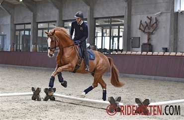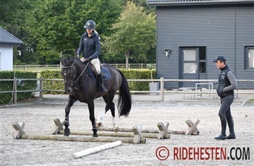 – Man kan også vælge at galopere over en bom, og så i springet skifte retning. Denne øvelse kan også bruges til at hjælpe hesten til at lære at lande i rigtig galop.