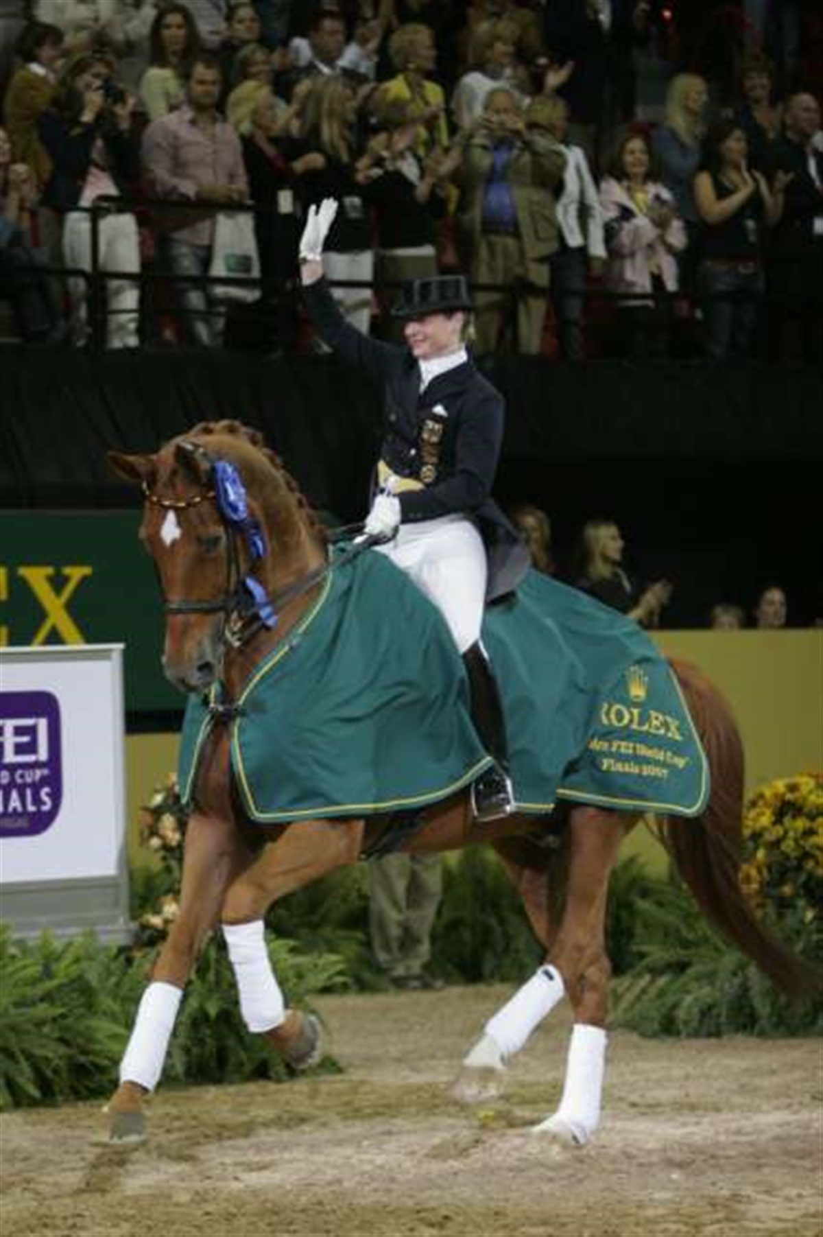Så fik det entusiastiske publikum i Thomas & Mack Center Las Vegas at se, hvordan en kür skal rides. Isabell Werth og Warum Nicht dansede sammen til musikken, og deres unikke fortolkning af musik og øvelser gjorde World Cup finalen til en fornøjelse at se. Væk var Warum Nichts nervøsitet og bekymring over omgivelserne, det var som om han pludselig var blevet voksen på hviledagen mellem Grand Prixen, som bestemt ikke var parrets fornemmeste præstation, og küren. De 12.000 tilskuere skabte en fantastisk kulisse om finalen, der blev rigtig seværdig, da de top fem bedst placerede ryttere kom på banen. Isabell selv var meget overrasket over, hvor godt "Hannes" klarede presset og den megen uro, men da hun oplevede, at han var koncentreret om opgaven, ja så kunne hun komme til at ride programmet og hesten, som de skulle, med de risici som skaber en virkelig oplevelse for tilskuerne. - Jeg har lært så meget om Hannes på denne tur, fortalte Isabell efter præmieoverrækkelsen, hun har også været med ham fra rejsen begyndte, Isabell var nemlig med i flyet hos hesten, da han blev fløjet til Las Vegas. 84,25% honorerede dommerne hende med, Imke Schellekens-Bartels og Sunrise kom ind på andenpladsen, i stor afstand efter vinderen, med 77,9%. Sunrise var kommet i brunst i det varme, solrige vejr i Las Vegas, og det bar programmet og ridtet lidt præg af. Amerikanske Steffen Peters og Floriano kom ind på en populær 3. plads. Den 17-årige vallak virkede lidt træt til sidst, og Peters vil nu lade det være op til hesten at bestemme, hvornår den skal pensioneres. - Vi vil tage det fra dag til dag, fortalte rytteren, der var fuld af beundring over hestens enorme lyst og vilje til at præstere inde på banen, 77,8% fik han og dermed slog han knebent Kyra Kyrklund og Max, der fik 77,5% for et smukt, velredet program. Desværre kom Tinne Vilhelmson og danske Solos Carex ikke til start. Parret havde ellers været en fornøjelse at følge i Grand Prixen, hvor de sluttede på 6. pladsen, men en feber satte en stopper for hestens deltagelse i finalen. Det andet danske islæt Maximus JSS redet af Catherine Haddad sluttede finalen på en 7. plads.