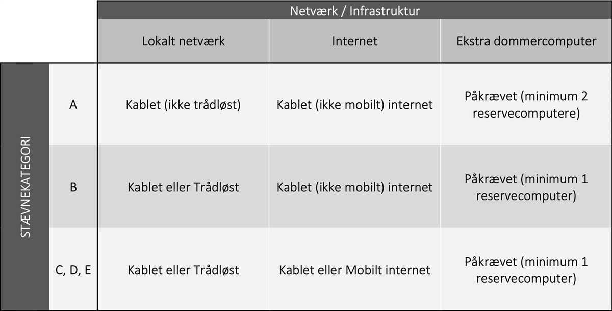 Computere skal anvende Microsoft Windows 10 fuldt opdateret eller Apple Mac. Der skal være installeret Google Chrome eller Microsoft Edge. Maskinerne skal være 100% opdateret inden de må anvendes til papirløs bedømmelse.