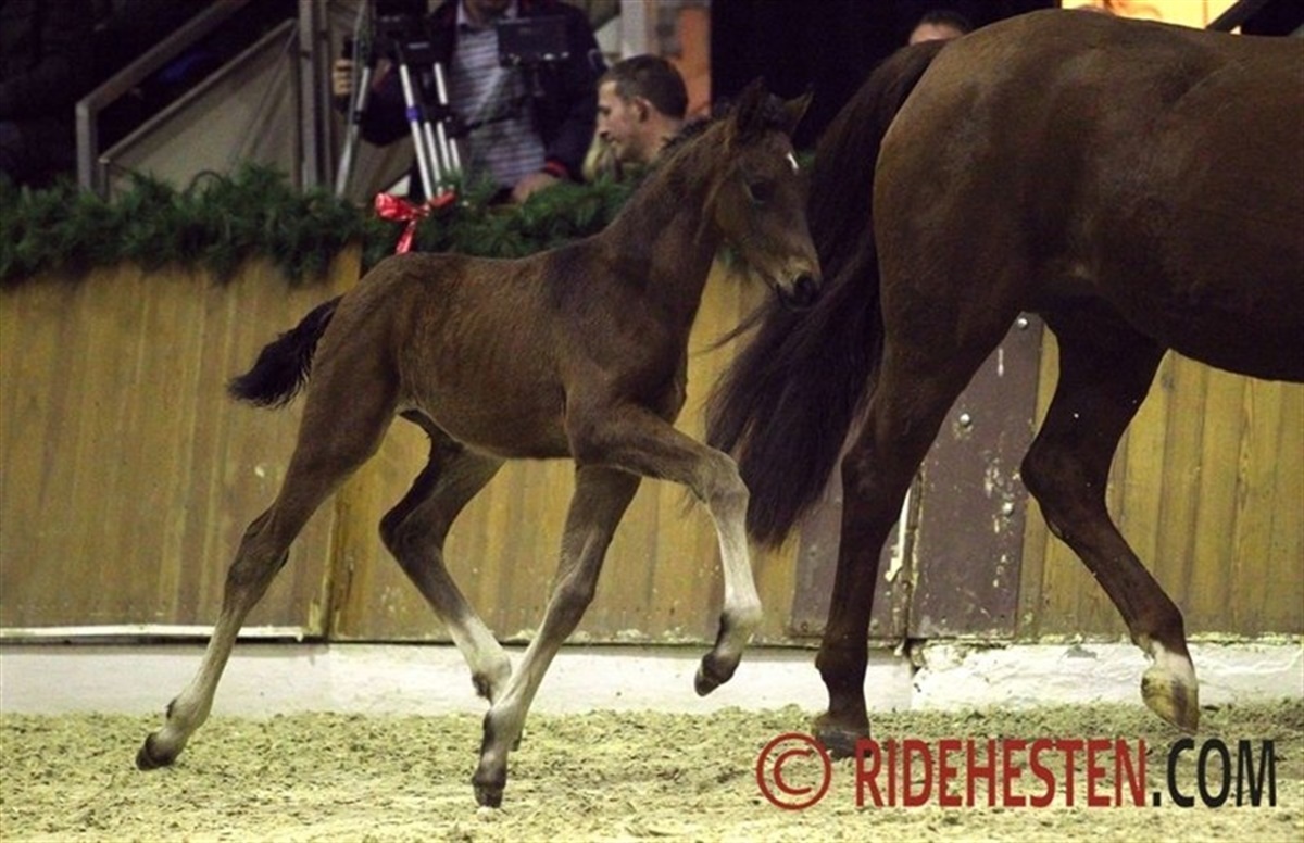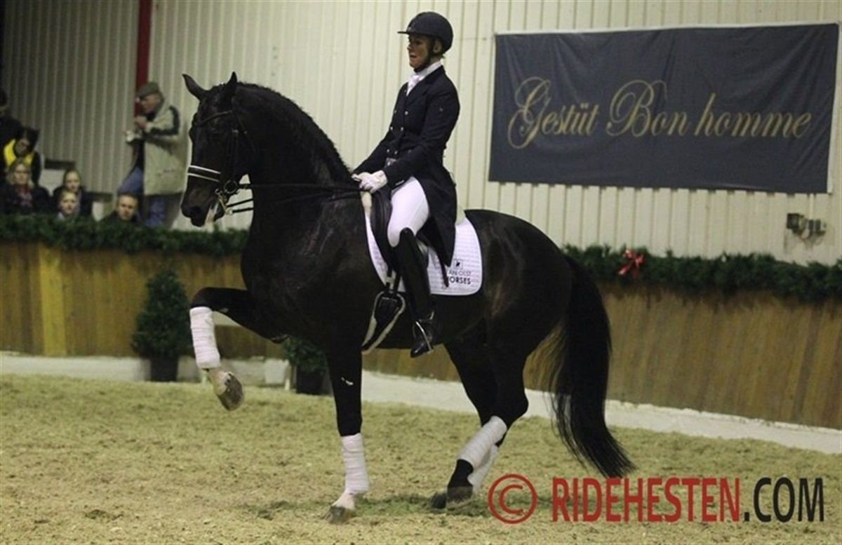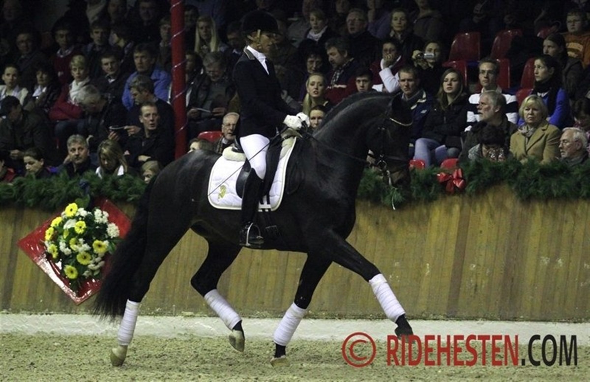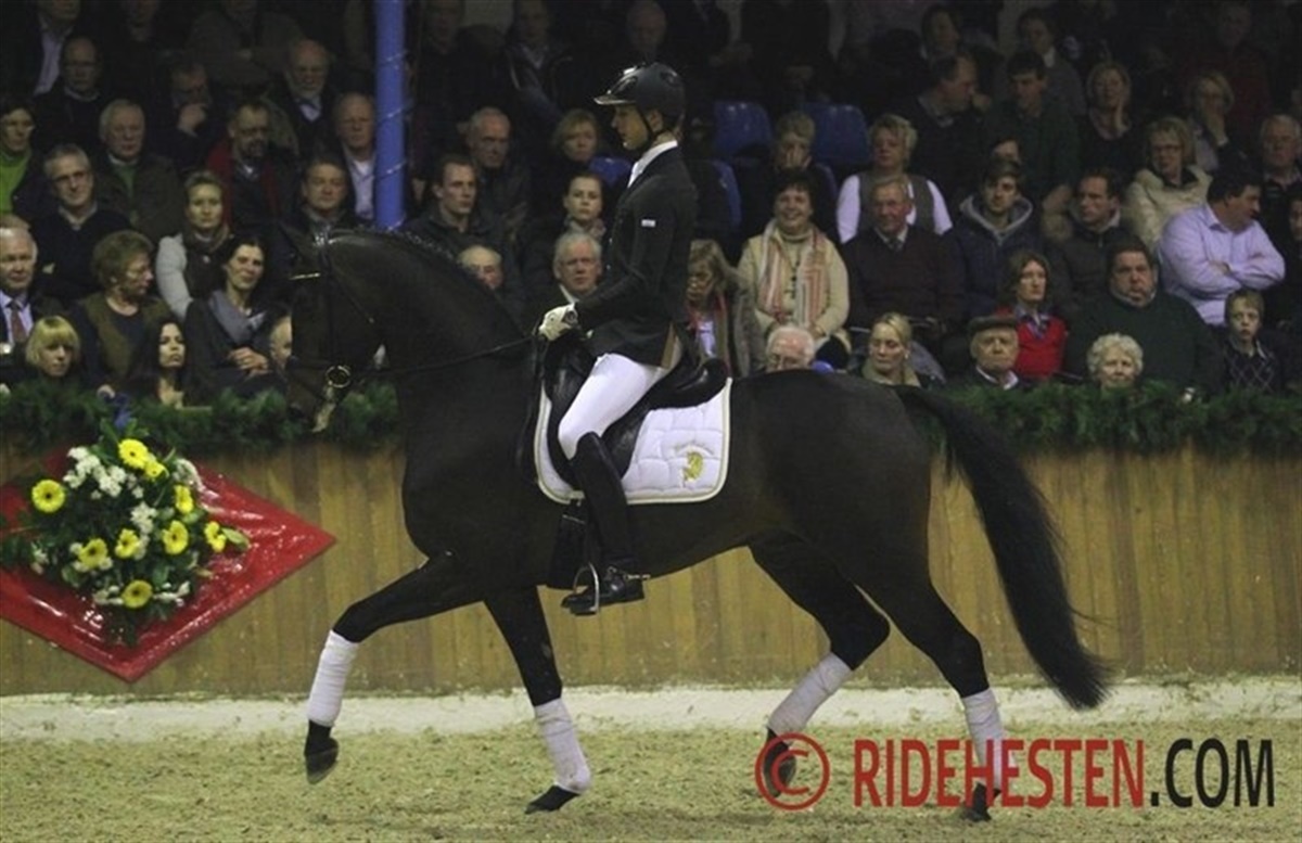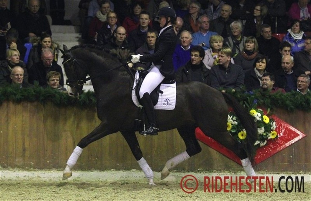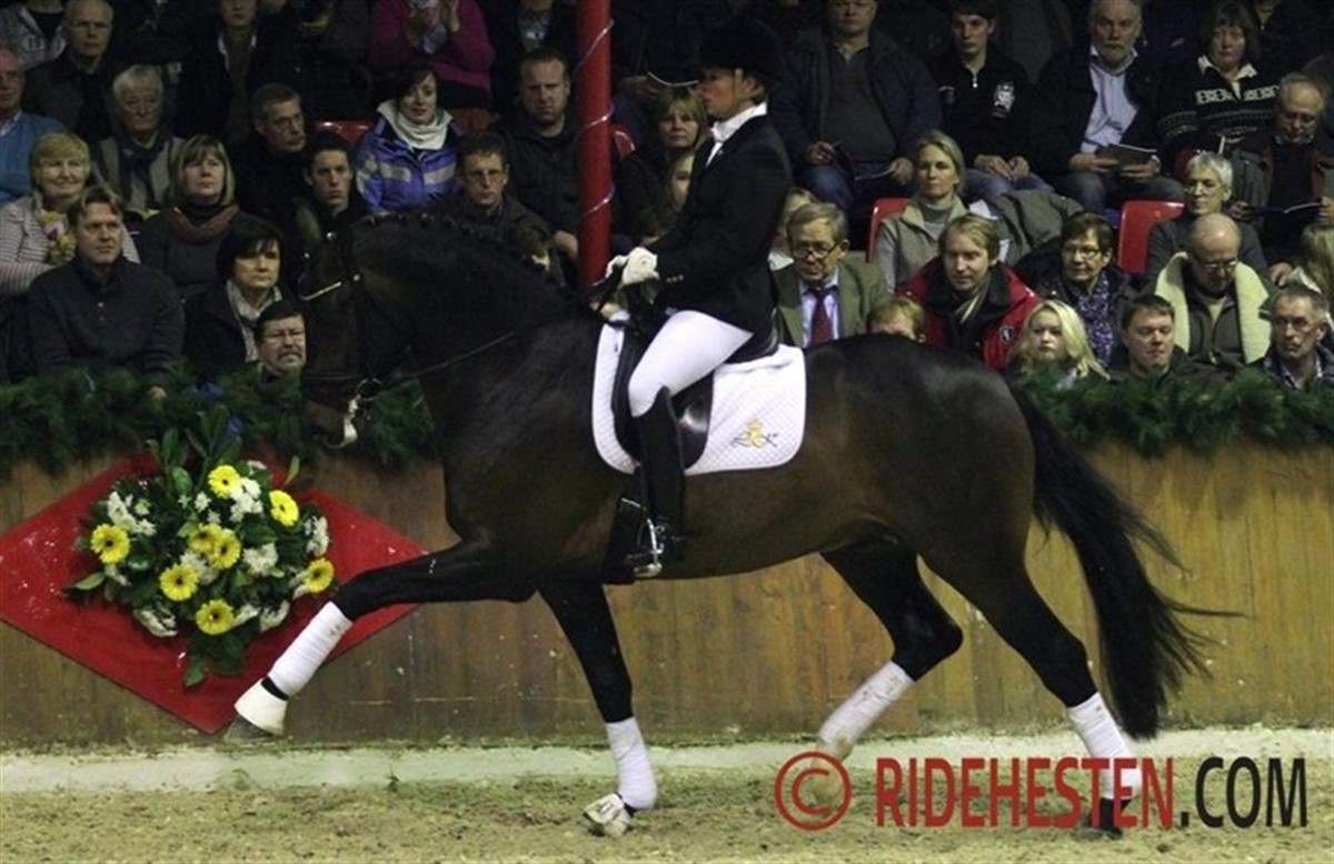 The stallion station Ludwig Kathmann is the German distributor of semen from stallions from Blue Hors, Stutteri Ask and Van Olst Stables, and therefore several Danish riders were in the limelight Friday night at the stallion show in Vechta. One of the highlights of the evening was Danish Anne van Olst and her powerful stallion Netto by Negro / Purioso which proved to be a complte piaffe/passage machine! Another powerful dressage prospect is the 5-year-old Blue Hors Don Olymbrio, which was shown by Maria A. Andersen who had her hands full, as this charming chestnut was in a very good mood Friday night. First rider at Stutteri Ask, Søren Møller Nielsen presented two very promising jumpers, 6-year-old Cavall Ask by Calido / C-Indoctro and 7-year-old Holsteiner Ci Ci Senjor Ask by Cassini I / Contender, which both did a convincing job over the fences. The Swedish bred 4-year-old Tomahawk by Tailormade Temptation / Sandro Hit (bred by Lena Nyström) was the Oldenburg auction highlight in 2011 and was popular with the German breeders last year. In Vechta he was superbly presented by former auction rider Kyra Wulferding and demonstrating three very big gaits. Two very young representatives of his first crop of foals were also presented in the arena and made a very good first impression. Continueing the string of Scandinavien riders were Norwegian Isabel Bache, who trains with Holga Finken, presenting the three-year-old very promising stallion Grey Flanell by Gribaldi / Clavecimbel, which already at the Oldenburg stallion licensing in 2012 showed himself as a powerful mover. Swedish rider Carl Hedin has formerly worked and trained at Hasse Hoffmann's in Denmark and is now holding a position as dressage rider at the German stallion station Bon Homme. He did a great job in showing the young Feu d'Or by Fackeltanz / Rohdiamant.