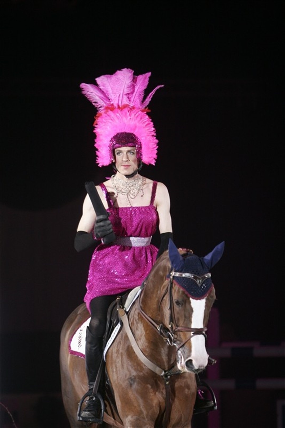 I dag er Dagens foto Thomas Velin klædt på til kostumespringning som sidste års Melodi Grandprix vinder Dramaqueen. Billedet er taget ved gallashowet til Hingestekåringen sidste år. Foto: ridehesten.com/Annette Boe Østegaard (2007)