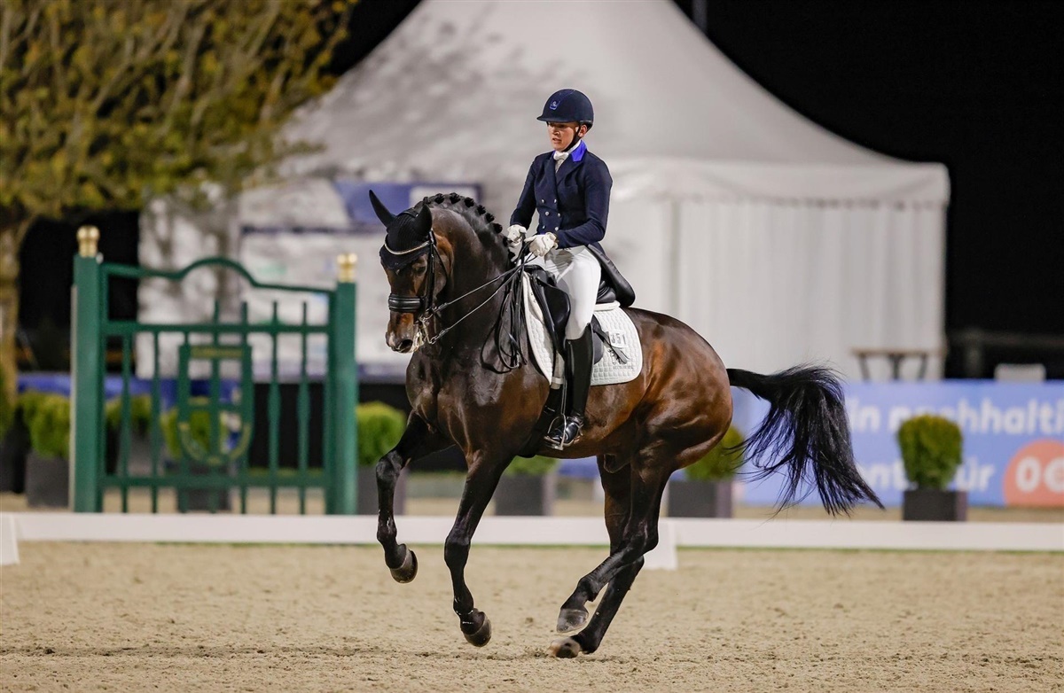 Nanna Skodborg Merrald og Blue Hors Farrell e. Fürstenball/Dacaprio i Intermediaire I til 74,82%.