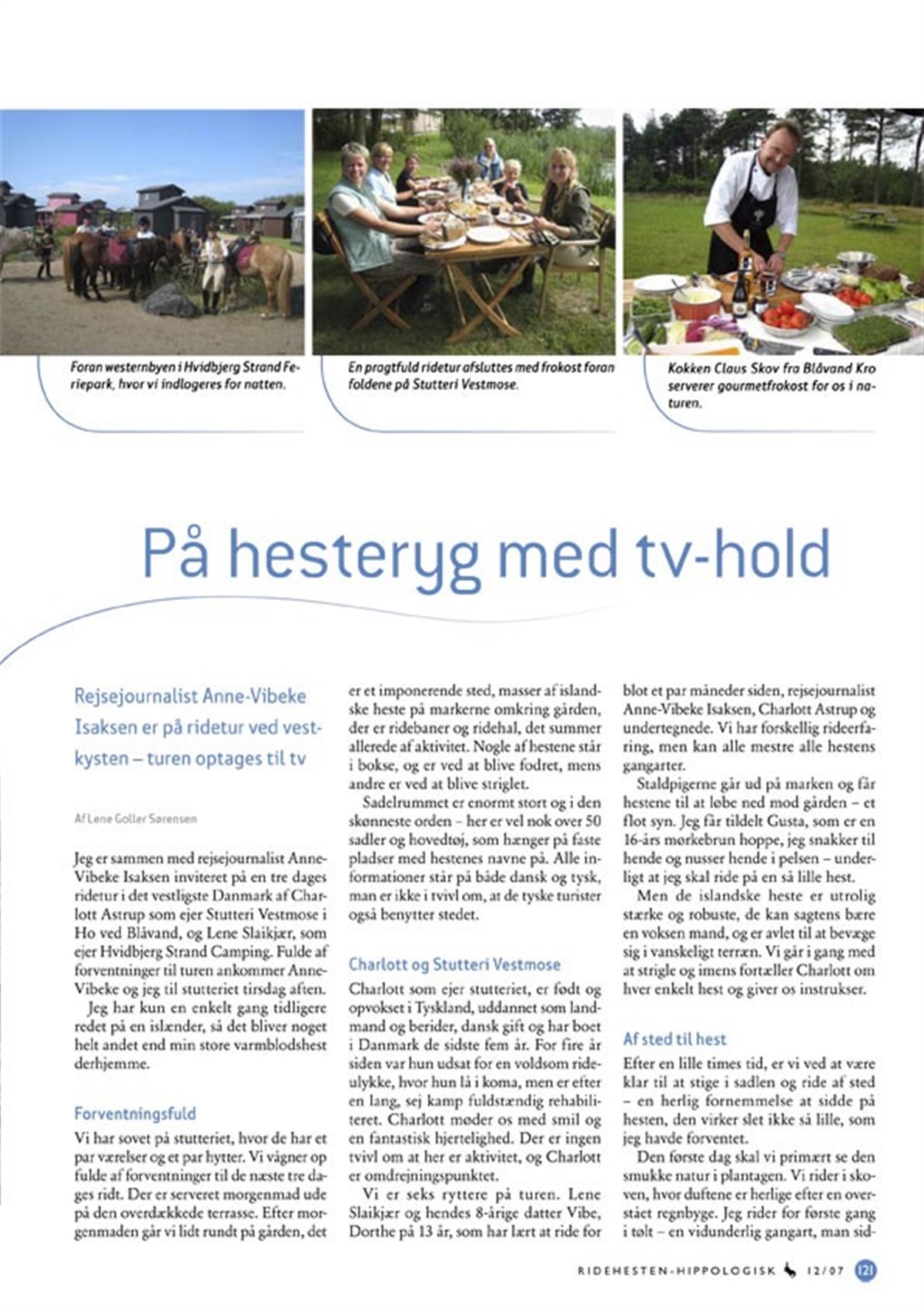 I december 2007 skrev vi i magasinet Ridehesten om en ridetur ved vestkysten, som blev optaget til tv, ligesom vi i Ridehesten Junior, januar 2008, bringer et interview med en af de yngste deltagere: 9-årige Vibe. Du kan nu se hele udsendelsen her på Ridehesten.com, hvor du kan følge rejsejournalist, Anne-Vibeke Isaksen, og de øvrige ryttere under deres flere dage lange færd på en flok islandske heste ved det barske Vesterhav. Der er dømt flot natur og dejlige rideture! Tryk på linket eller besøg vores WebTV-side for at se hele udsendelsen.
