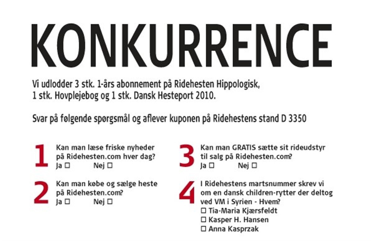 Ved hingstekåringen i Herning kunne du svare på spørgsmål omkring Ridehesten. Vi har nu udtrukket de heldige vindere, som kan ses nedenfor: Vinderne af 3 stk. årsabonnementer er: Monica Jørgensen fra Nordborg Lene Sommer fra Svendborg Janne Thomsen fra Thisted Vinderen af 1 stk. Hovplejebog: Kristina Thomsen fra Vodskov Vinderen af 1 stk. Hestesport: Berit Henriksen fra Odense SV Vi ønsker vinderne tillykke. Præmierne bliver sendt direkte til vinderne.
